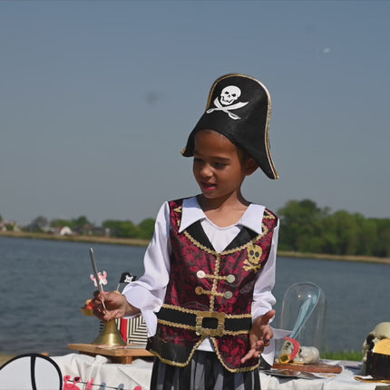 Met dit complete piratenpak kan elk kind zich een echte avonturier op zee voelen, klaar om verborgen schatten te ontdekken.
