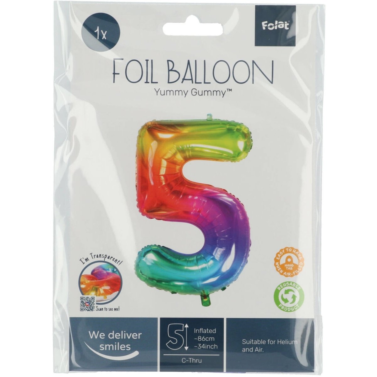 Folieballon Yummy Gummy Rainbow Cijfer 5 - 81 cm. Inhoud: 1 folieballon. Kleur: Meerkleurig. De voorkant is transparant en de achterkant is zilverkleurig. Bijvoorbeeld te gebruiken tijdens de volgende feestgelegenheid/feestgelegenheden: Verjaardag, Kinderfeestje en Jubileum. Deze folieballon is 32 inch/81 cm. Het artikel is gemaakt van folie.