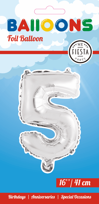 Folie Ballon Cijfer 5 Zilver 41cm met Rietje
