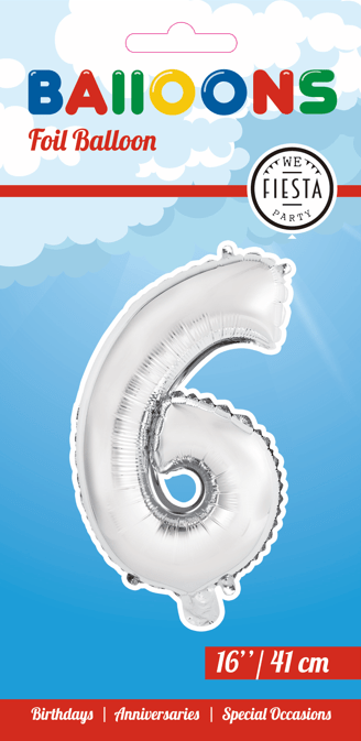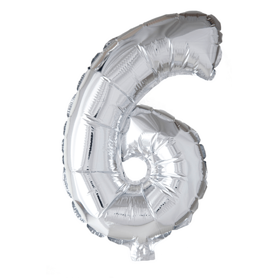 Folie Ballon Cijfer 6 Zilver 41cm met Rietje