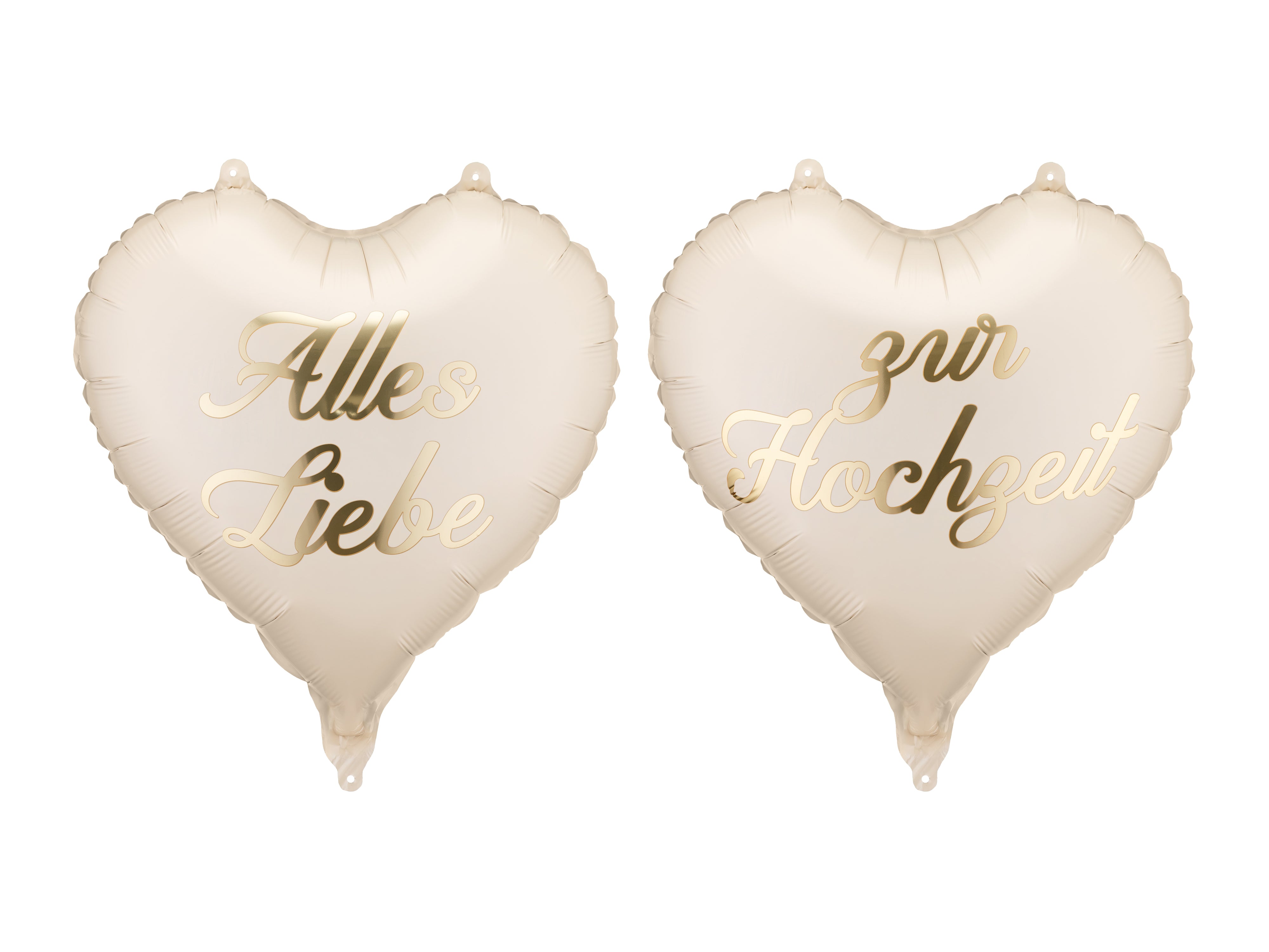 Vier een huwelijk op een stijlvolle manier met deze hartvormige folieballonnen ‘Alles Liebe zur Hochzeit’. De set bestaat uit twee ballonnen in een zachte beige kleur met goudkleurige opdruk, perfect voor bruiloften, huwelijksjubilea of romantische decoraties. Te gebruiken met lucht of helium en eenvoudig op te blazen dankzij het meegeleverde rietje.