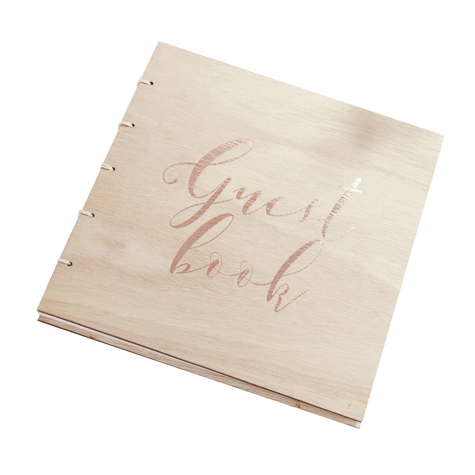 De houten kaft heeft een prachtig ontwerp in roségoudfolie - de perfecte metallic touch om uw grote dag nog specialer te maken! Een prachtig gastenboek en een perfecte bewaarplaats voor het bruidspaar!