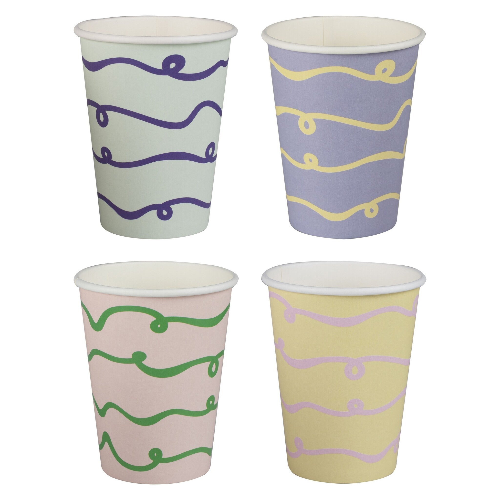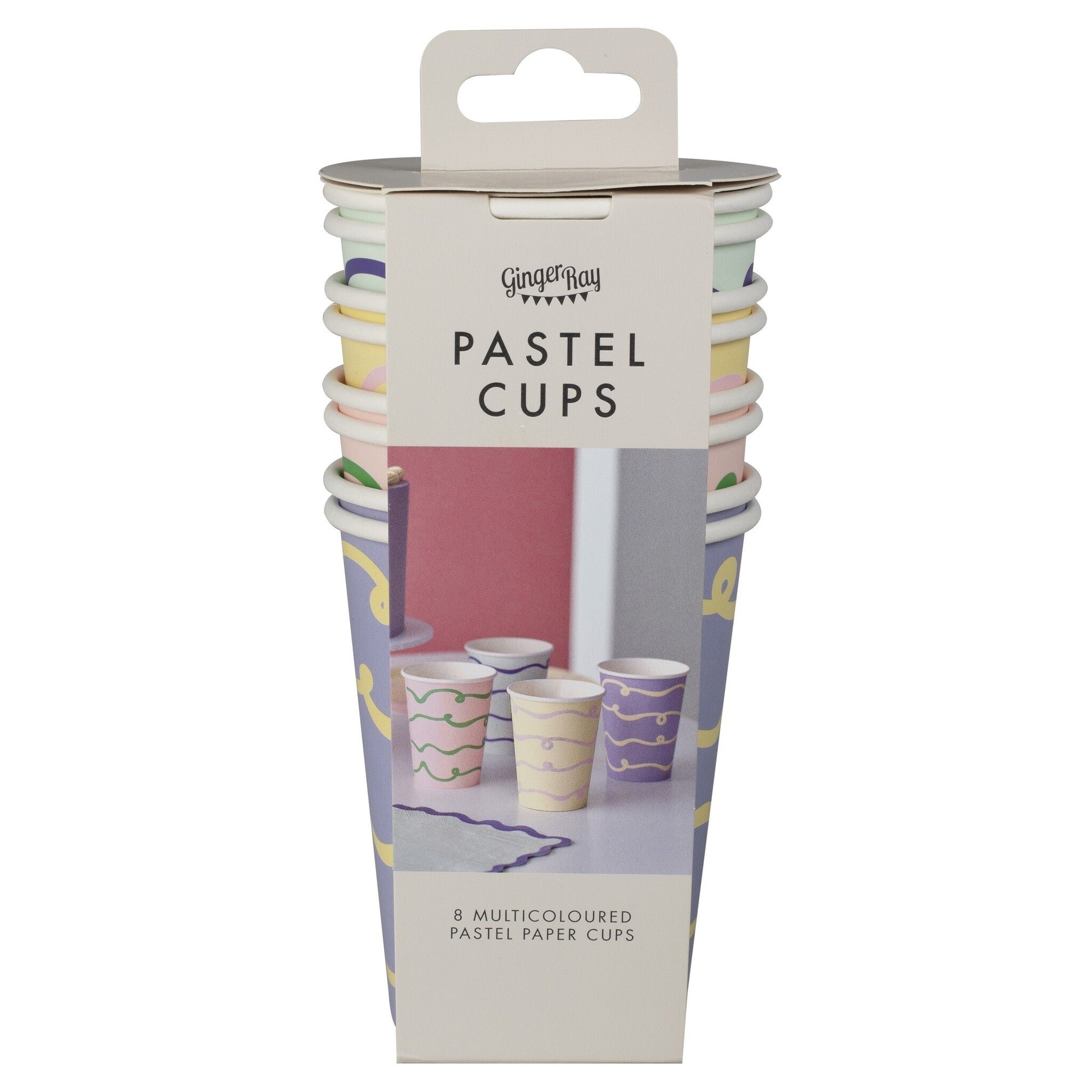 Bevat 8 pastelkleurige papieren bekertjes in lila, geel, groen en roze.