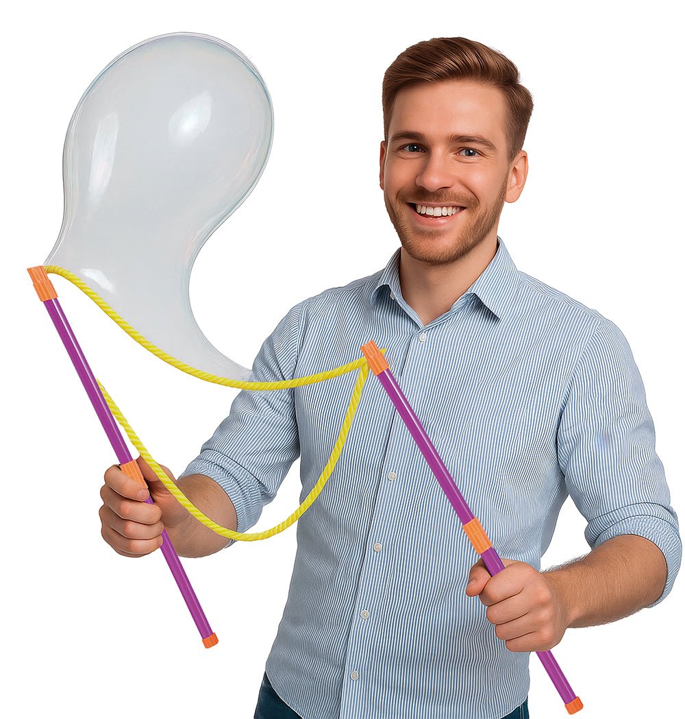 Deze vrolijke 6-delige bellenblaasset zorgt voor urenlang speelplezier. De set bevat een bellenblaas, vier stokjes en een touw, zodat je direct kunt beginnen met het maken van grote, fonkelende bellen. Gemaakt van duurzaam PVC voor langdurig plezier.