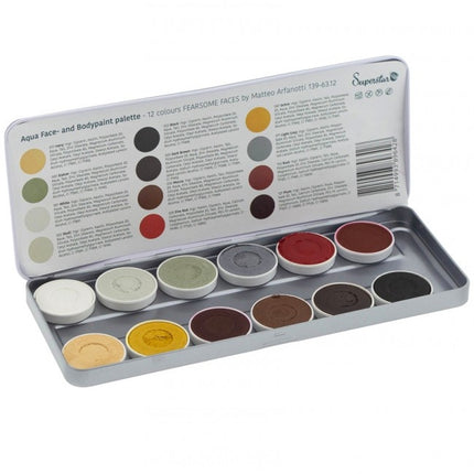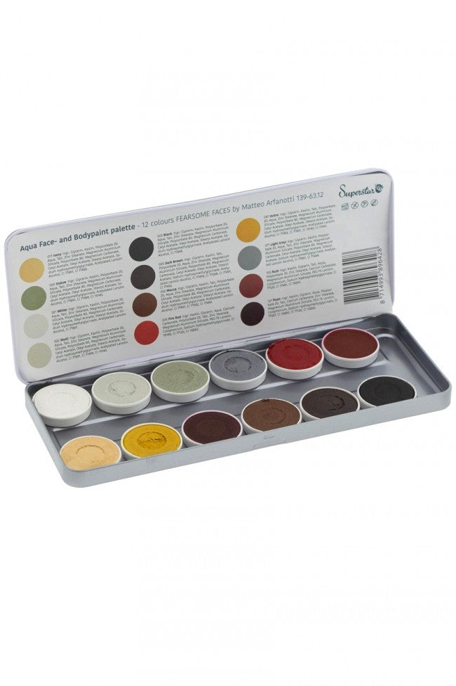 Het Superstar Schminkpalet Fearsome Faces, ontworpen door Matteo Arfanotti, bevat 12 gebruiksvriendelijke kleuren waterschmink van hoge kwaliteit. Deze schmink voldoet aan de strenge eisen van de Europese Cosmetica Wetgeving (1223/2009/EG).