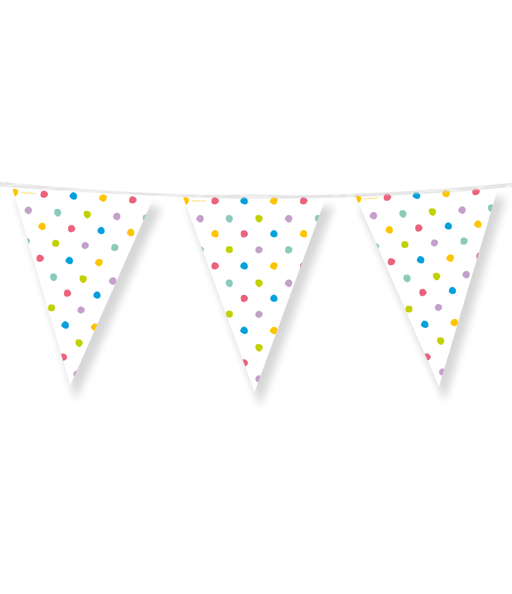 Geef ieder feestje meteen een kleurrijke boost met deze Party flags - Party Dots! De vrolijke stippenprint maakt deze vlaggenlijn een echte blikvanger en perfect voor verjaardagen, kinderfeestjes, summer parties of elke gelegenheid die wel wat extra kleur kan gebruiken.