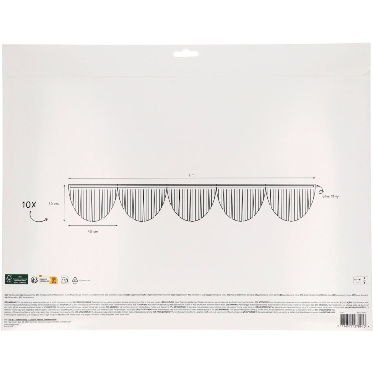 Vrolijk en elegant! Feest Fringe Backdrop - Pastel - 2 x 2 m. Inhoud: 10 fringe stroken, ieder met 5 kleuren. Bijvoorbeeld te gebruiken tijdens de volgende feestgelegenheid/feestgelegenheden: Verjaardag, Themafeest. Creër de mooiste backdrops met deze fringe stroken. Er zijn 10 losse stroken, iedere strook heeft 5 kleuren, is 200 x 30 cm en heeft een handige plakrand. 1 kleur heeft de vorm van een halve cirkel en is ongeveer 40 x 30 cm. Alle stroken bij elkaar zijn ongeveer 200 x 200 cm. De kleuren zijn: roze, geel, turquoise, oranje en iriserend. Alle fringes zijn van papier, behalve de iriserende, deze is van folie. Dit artikel is gemaakt van papier en folie.
