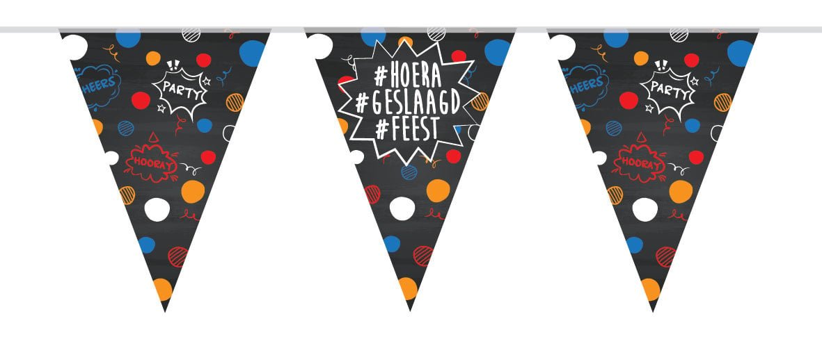 Inhoud: 15 vlaggen (verdeeld over 6 meter en 2 meter koord aan beide zijden)