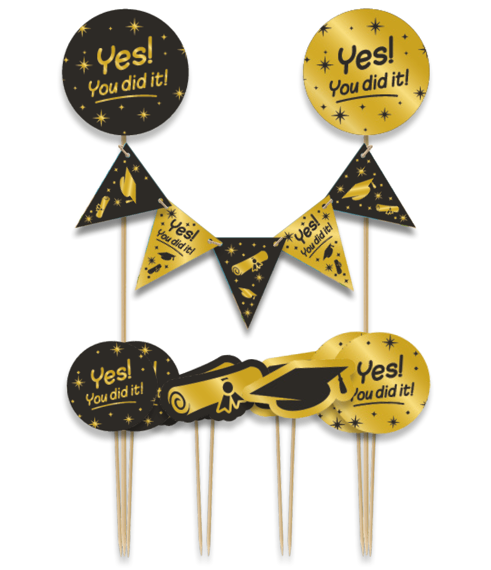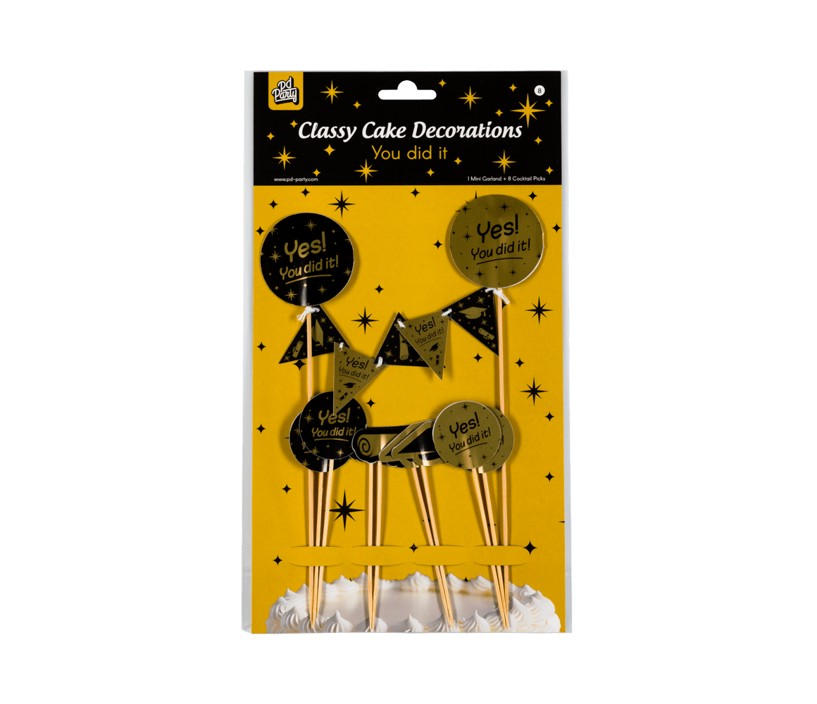 Maak van elke taart een ware blikvanger met deze cake decorations You did it! Is er iemand geslaagd dan is dit de perfecte decoratie in een taart. De prikkers zijn eenvoudig in de taart of cake te plaatsen voor een opvallend effect.