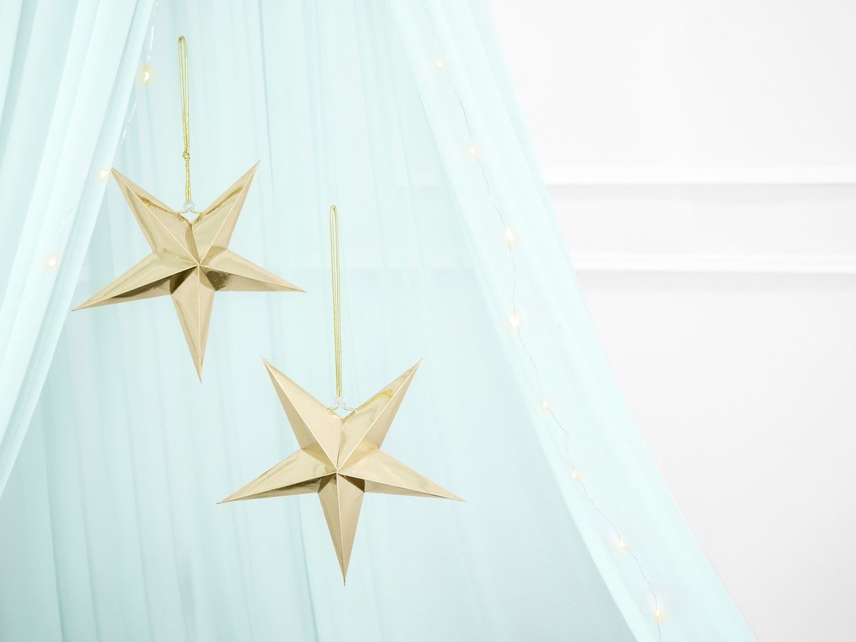 Inhoud: Papier ster, vijf punt, gemaakt van spiegel goud papier, met goud touw, diameter ong. 45 cm. Doe het zelf product.