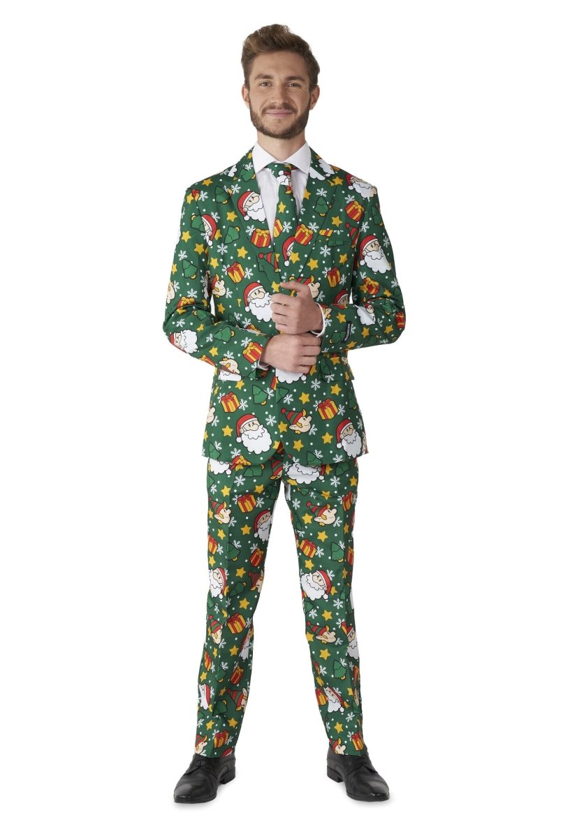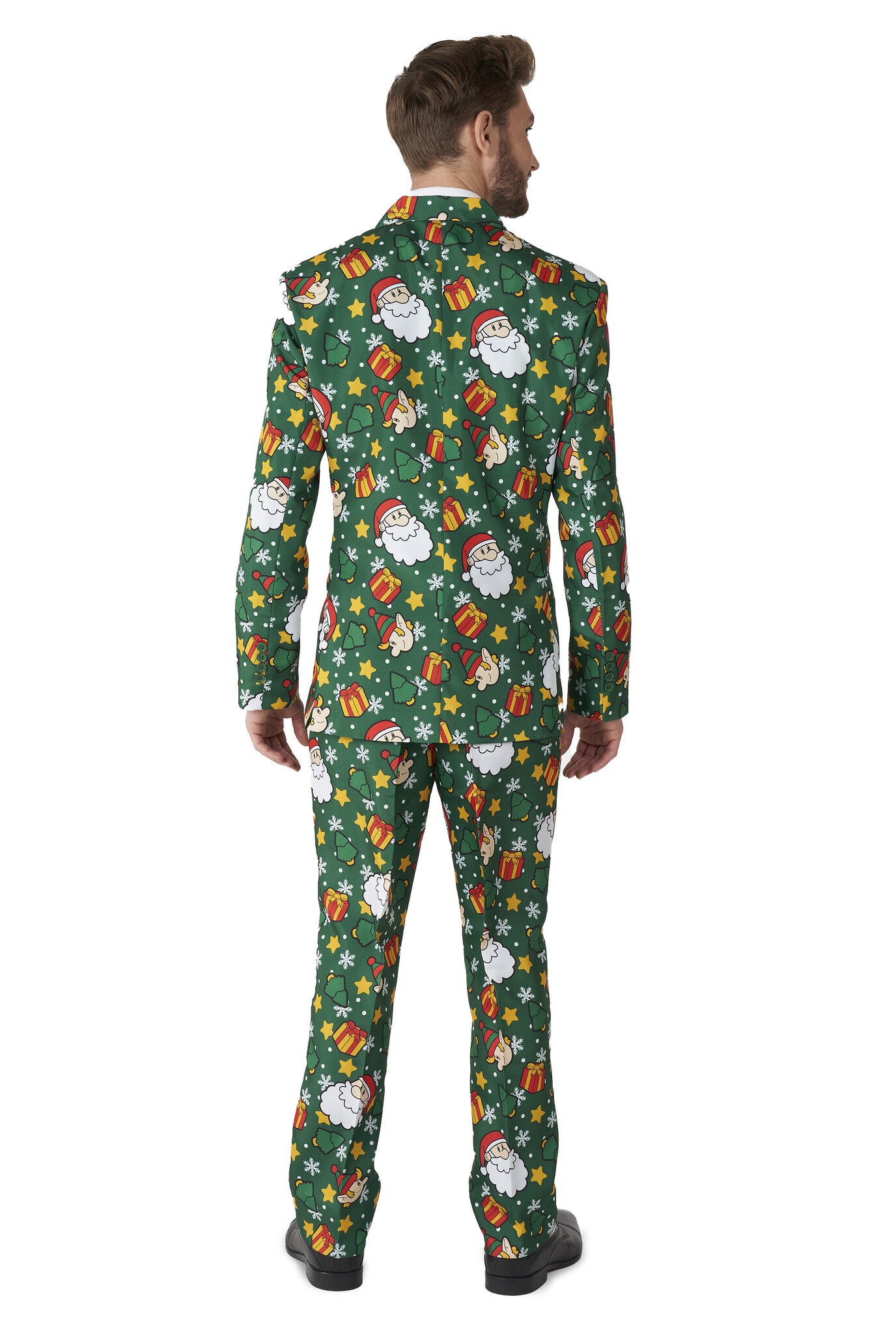 Dit groene kerstpak zal zeker in de smaak vallen bij de hele familie en al je collega's. De print bevat alles wat met kerst te maken heeft, zoals cadeautjes, bomen, elfjes en natuurlijk de Kerstman. Perfect voor de feestdagen! De slim fit outfit bestaat uit een jasje, broek en stropdas. De broek heeft een verstelbare tailleband voor een perfecte pasvorm.