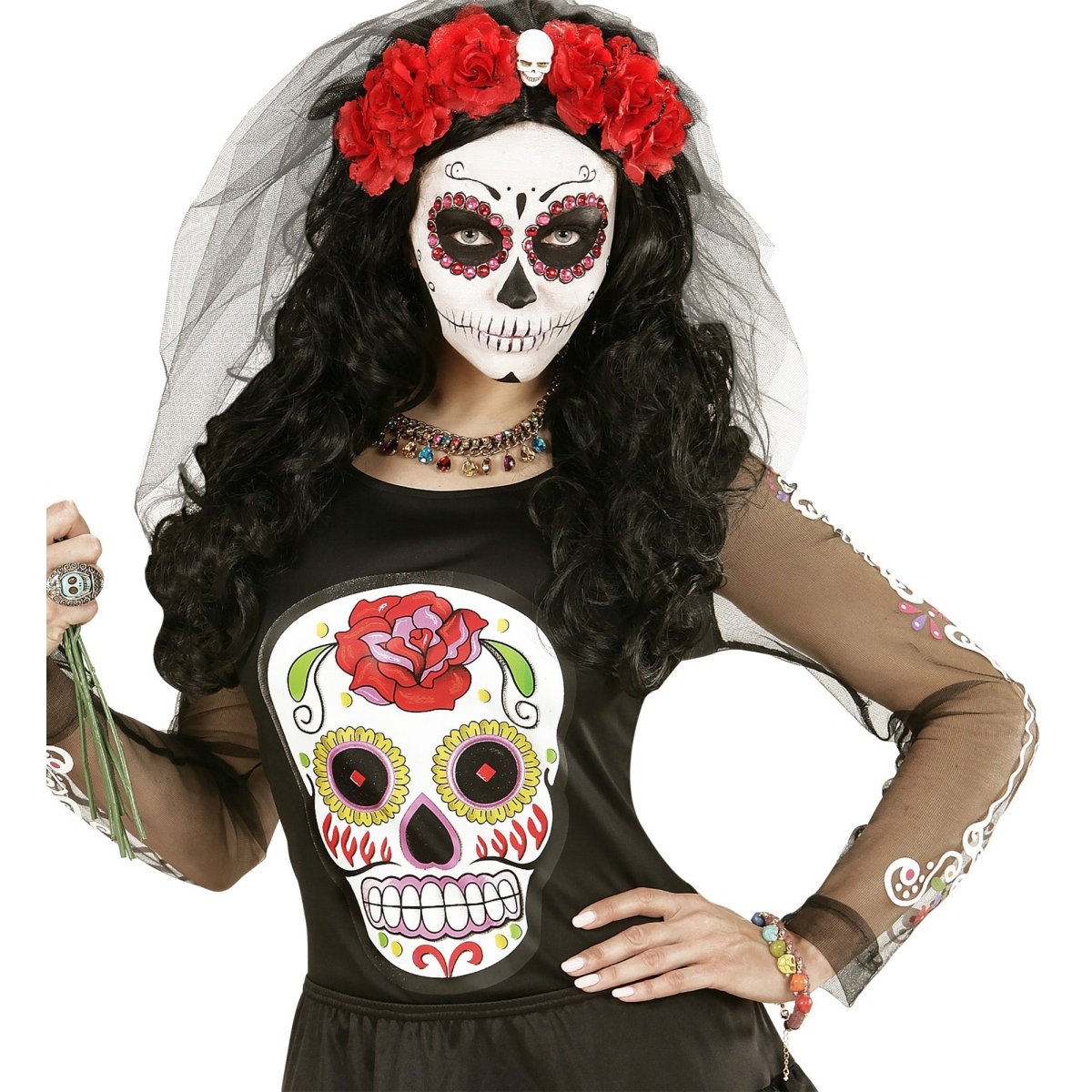 Maak je Halloween-look compleet met deze opvallende armband met kleurrijke schedelbedels. Perfect als accessoire voor feestjes, verkleedpartijen of cosplay.