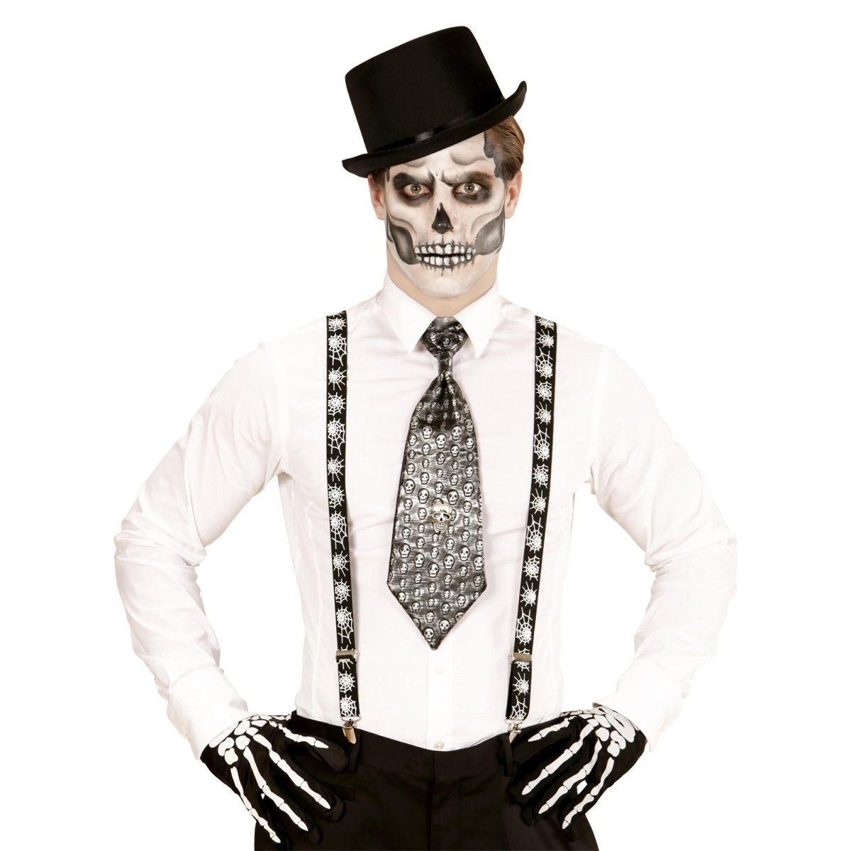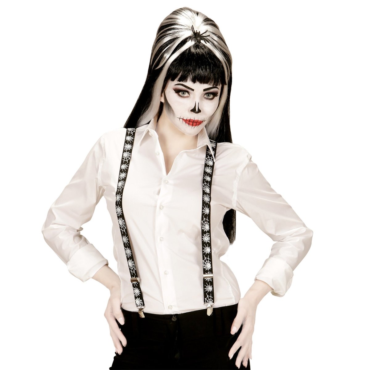 Maak je Halloweenoutfit compleet met deze zwarte en witte bretels met spinnenwebdesign. Ideaal voor verkleedpartijen, themafeesten of als opvallend accessoire bij je kostuum.