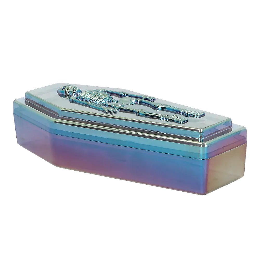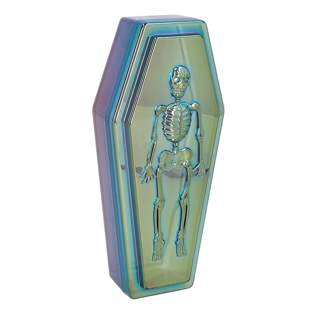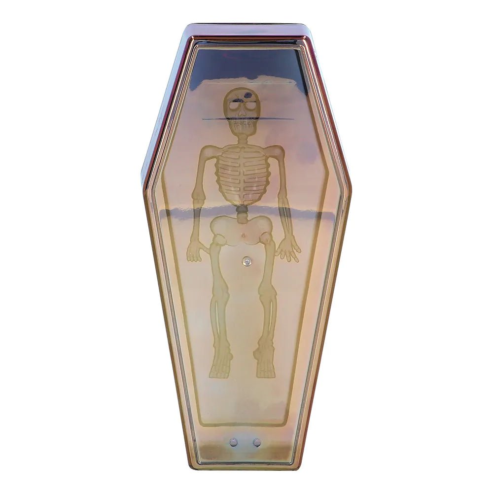 Deze kleurrijke doodskist van 19cm is te gek als decoratie voor een creepy Halloween feestje. De kist is versierd met het relief van een skelet, wat het een echte eyecatcher maakt. Leuk om te combineren met wat skulls en skeletten.