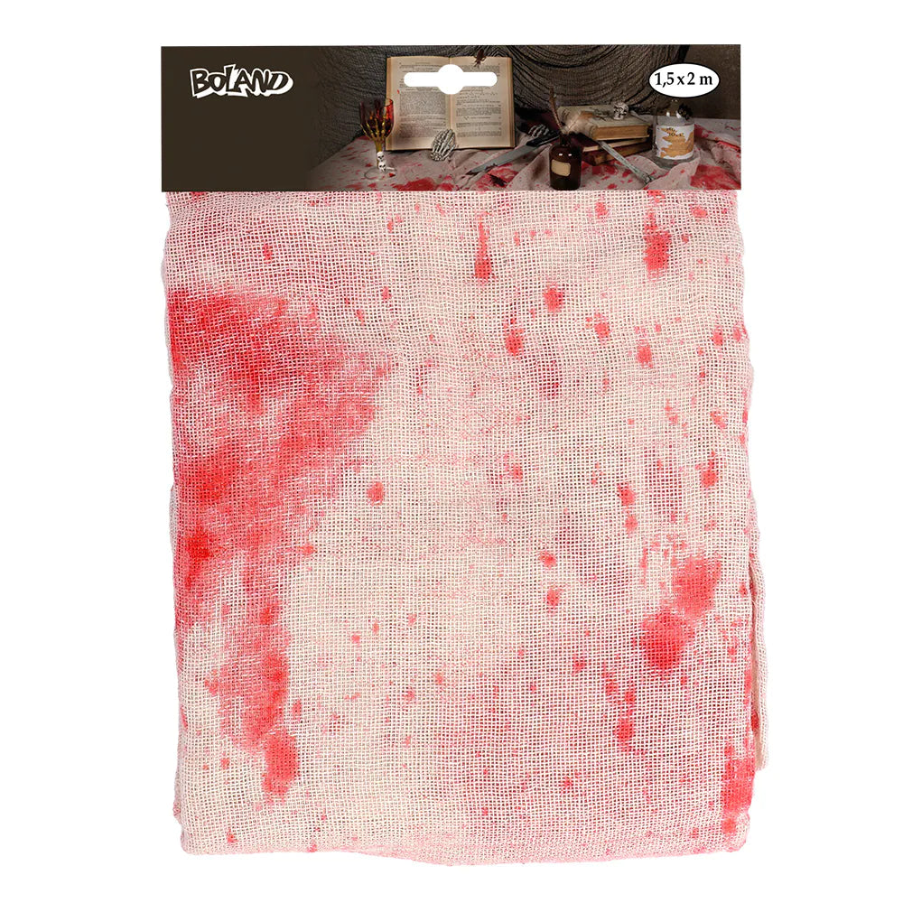 Dit bloederige kleed (1,5 x 2 m) is een angstaanjagend en opvallend decoratiestuk waarmee in een handomdraai een tafel of Halloween locatie omgetoverd wordt tot een lugubere scène uit een horrorfilm. Het witte kleed, doordrenkt met bloederige vlekken, is perfect voor het toevoegen van een extra dosis griezelige sfeer aan een Halloweenfeestje of spookhuis en laat iedereen sidderen van angst.