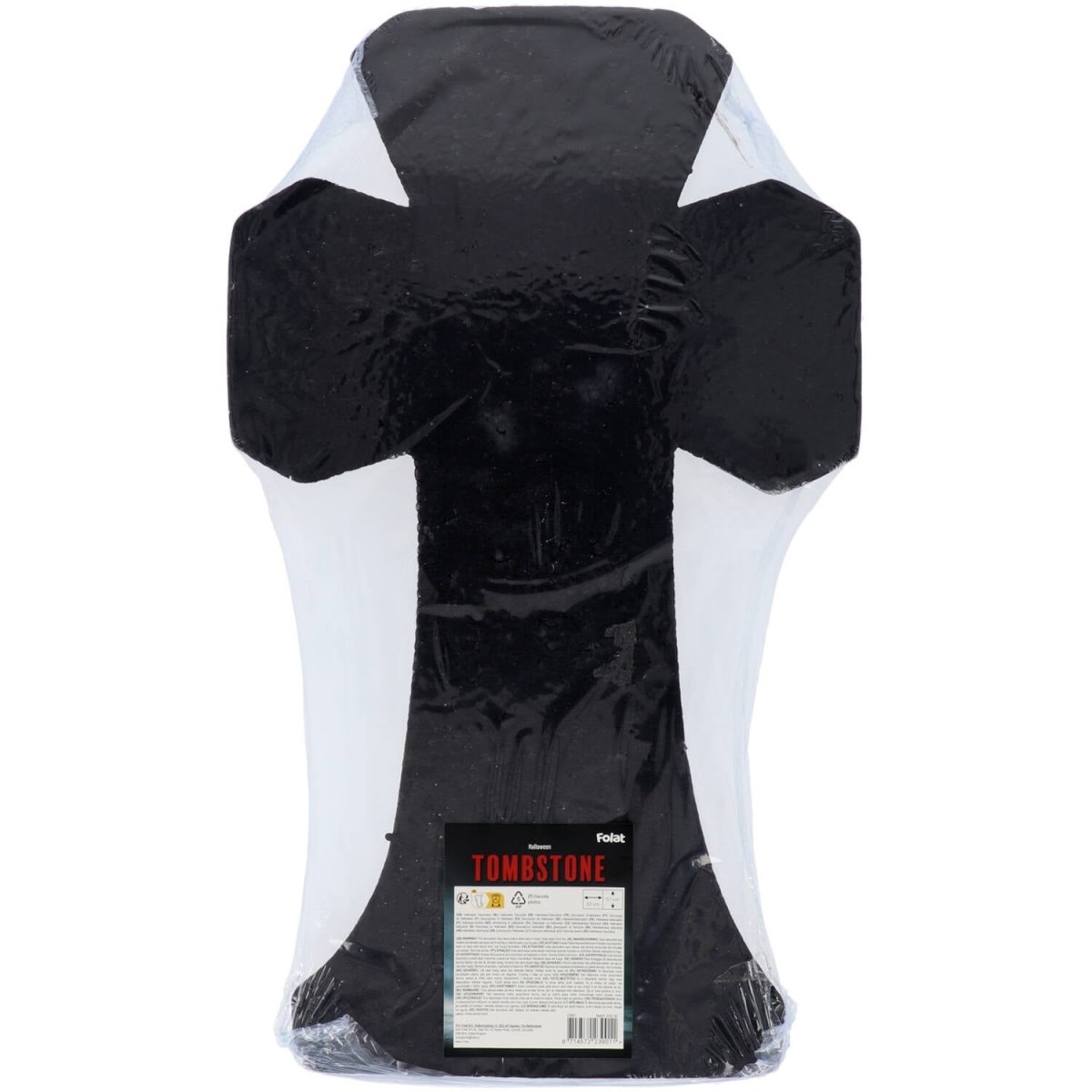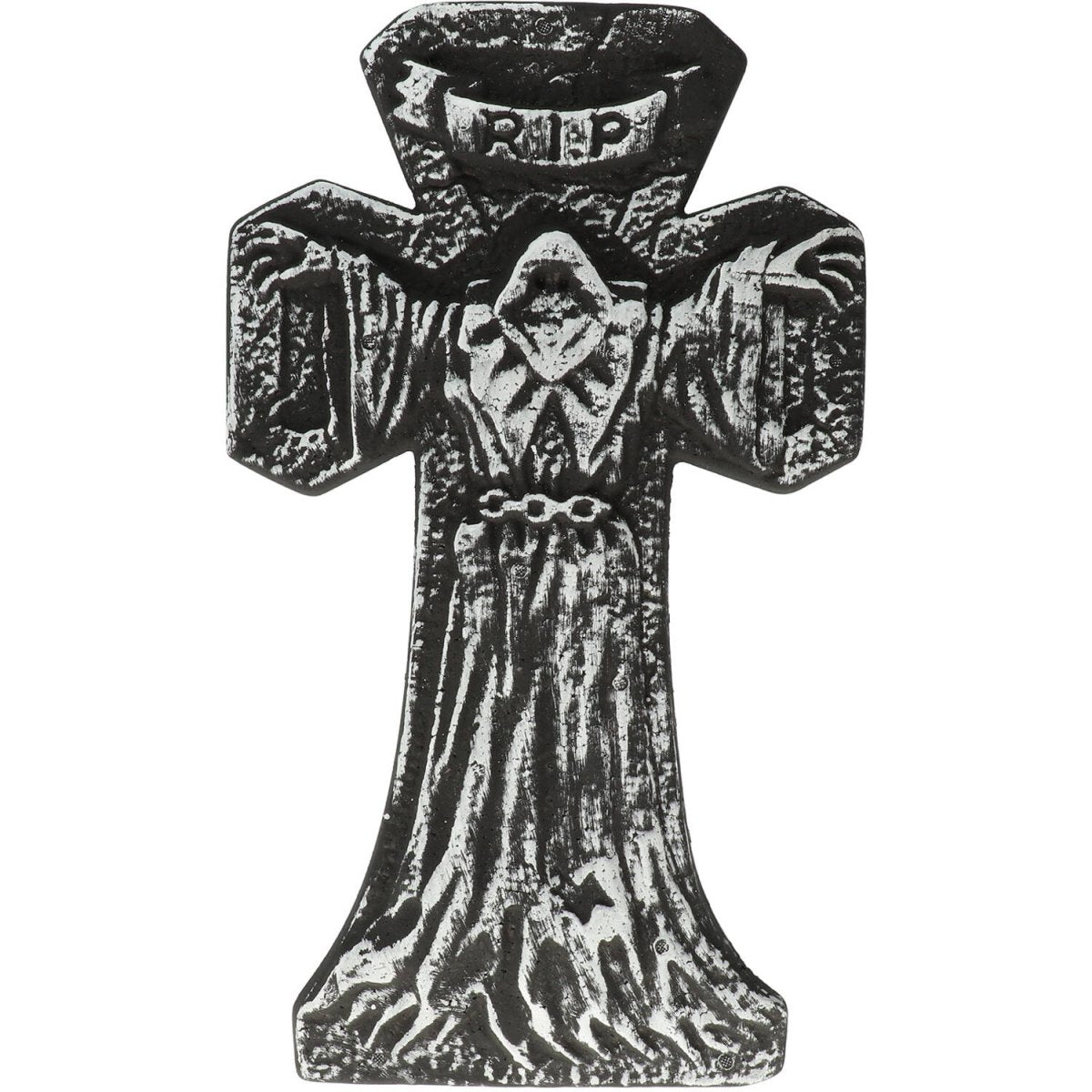 Geen rust op dit feest! Grafsteen kruis - Halloween - 33 x 57 cm. Inhoud: 1 grafsteen kruis. Bijvoorbeeld te gebruiken tijdens de volgende feestgelegenheid/feestgelegenheden: Halloween, Themafeest. Grafsteen in de vorm van een kruis met een verweerde look. Voor spookachtige feesten waar er zeker geen rust zal heersen. Dit artikel is gemaakt van foam.