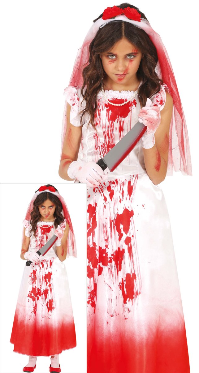 Maak je griezelige Halloweenlook compleet met deze bloederige jurk voor meisjes. De set bestaat uit een jurk en bijpassende sluier, beide gemaakt van polyester voor comfort en duurzaamheid. Perfect voor trick or treaten, Halloweenfeestjes of verkleedpartijen met een spooky effect.