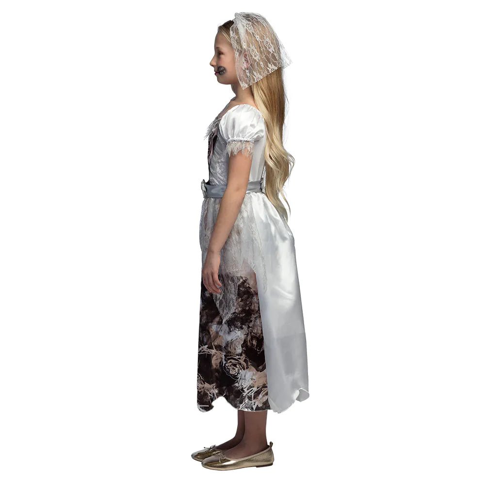 Een griezelig zombie bruid kostuum voor meisjes. Het kostuum bestaat uit een bruidsjurk met kanten details en riempje en een tiara met sluier. Een leuk kinderkostuum voor kinderen van 4-6 jaar om tijdens Halloween in stijl langs de deuren te gaan of naar een Halloween feestje te gaan.