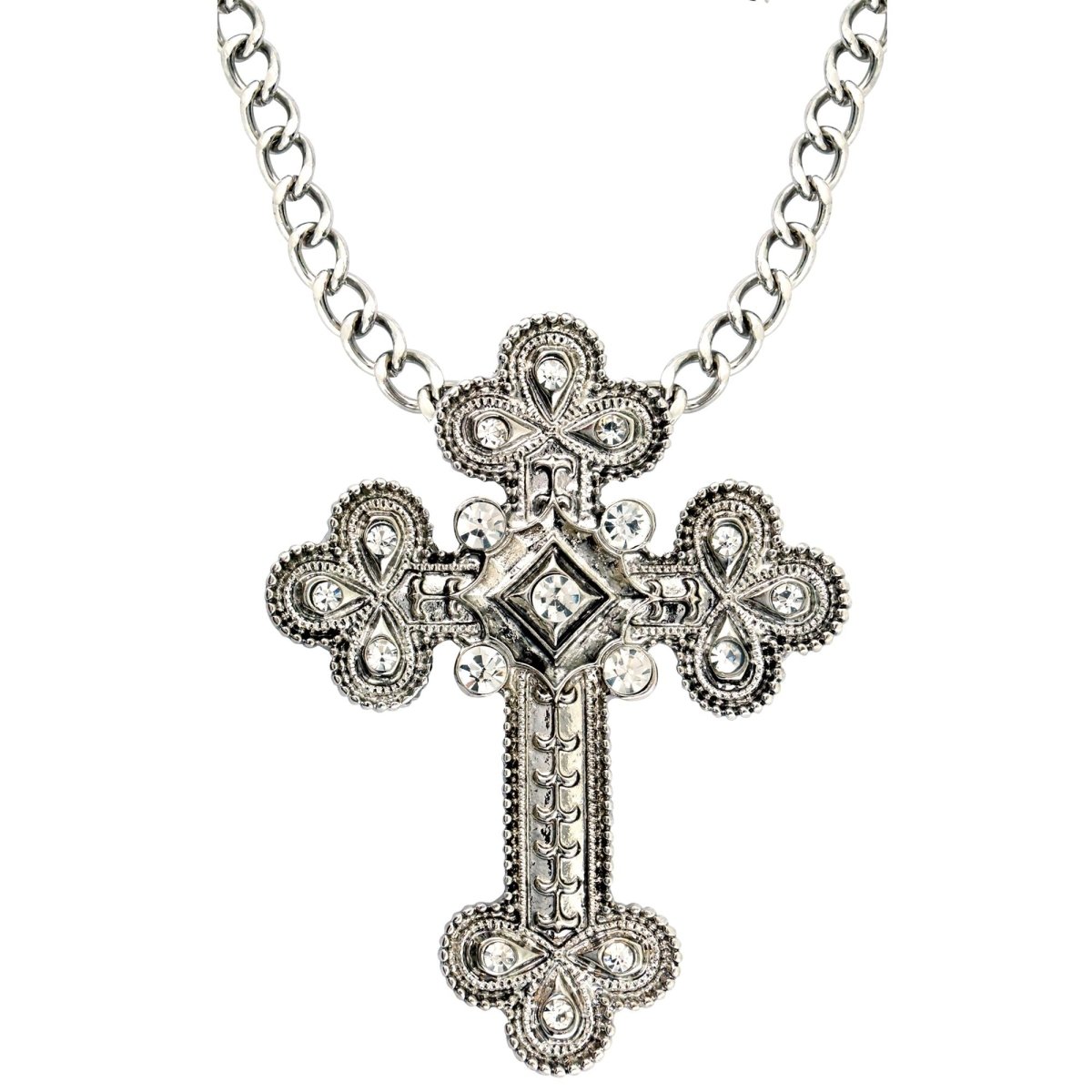 Maak je griezelige of stijlvolle Halloweenlook compleet met deze zilverkleurige ketting met kruis en strass-steentjes. Perfect als accessoire voor kostuums, themafeesten of verkleedpartijen.