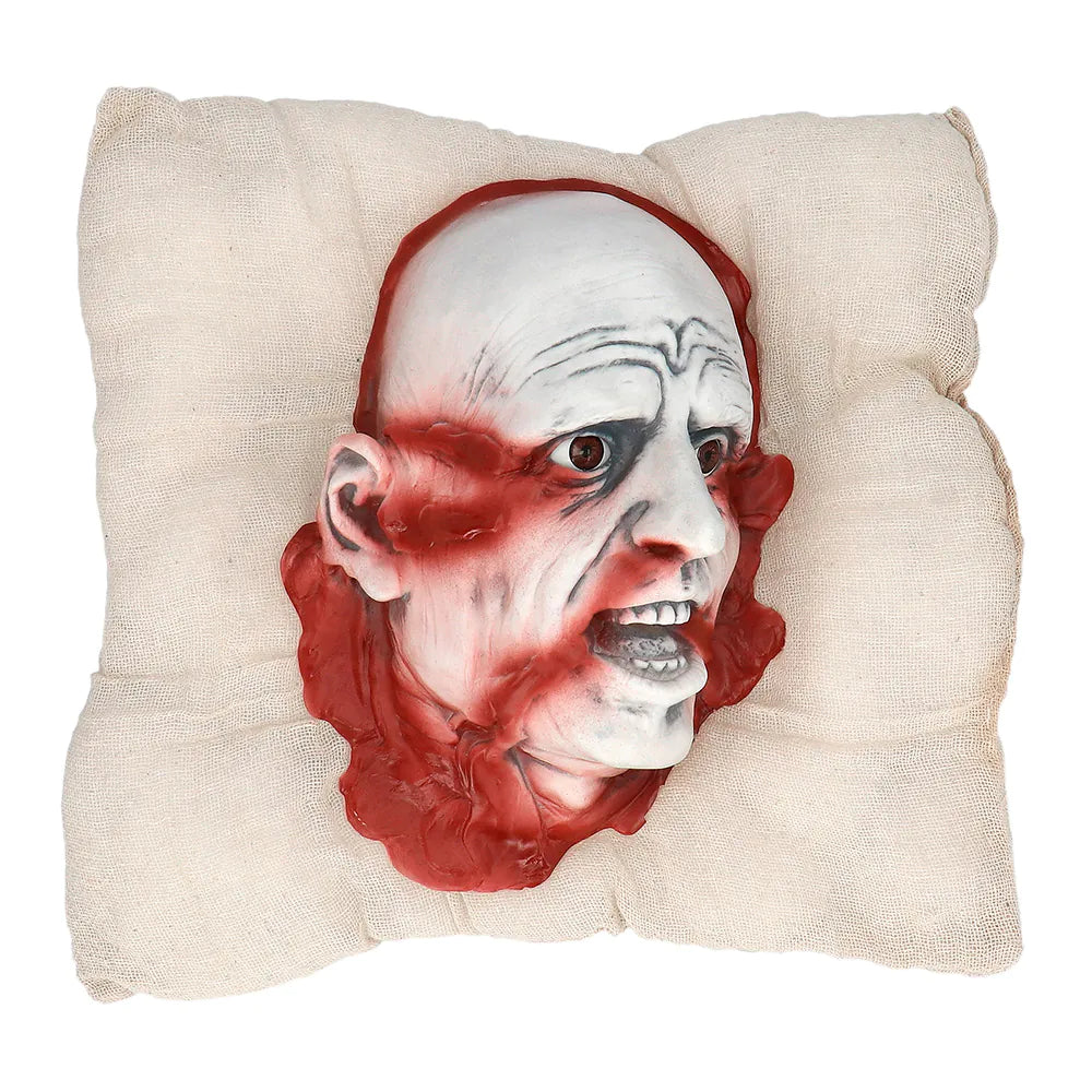 Breng griezelige horror naar je Halloween-feest met dit Kussen Hoofd met Bloed van 38 cm. Het realistisch bloederige hoofd is perfect om mensen te laten schrikken en vormt een opvallende decoratie voor thuis of in een spookhuis.