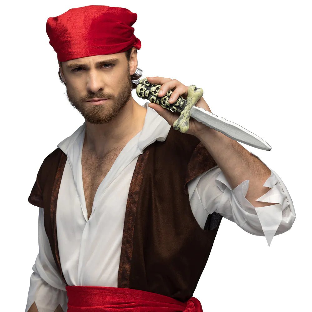 Deze griezelige dolk is een unieke accessoire die perfect past bij een stoer piratenkostuum of duister demonenkostuum. De dolk is 30 cm groot en heeft een gedetaileerd handvat versierd met schedels voor een extra griezelige look. Dit maakt hem zowel voor carnaval en themafeesten als voor Halloween het perfecte accessoire.