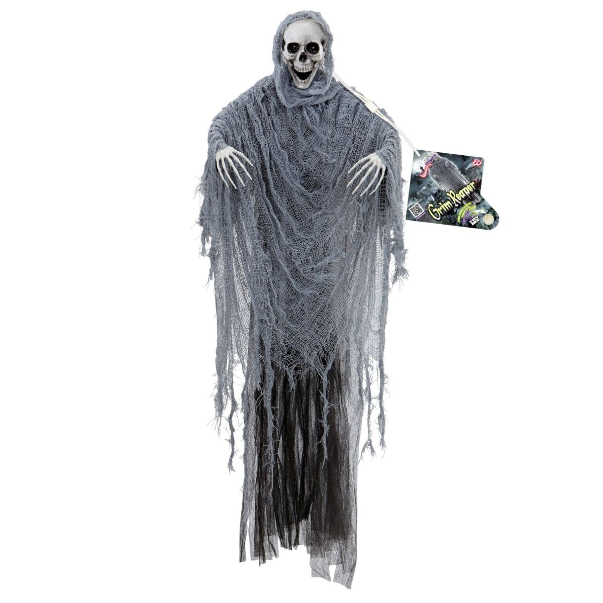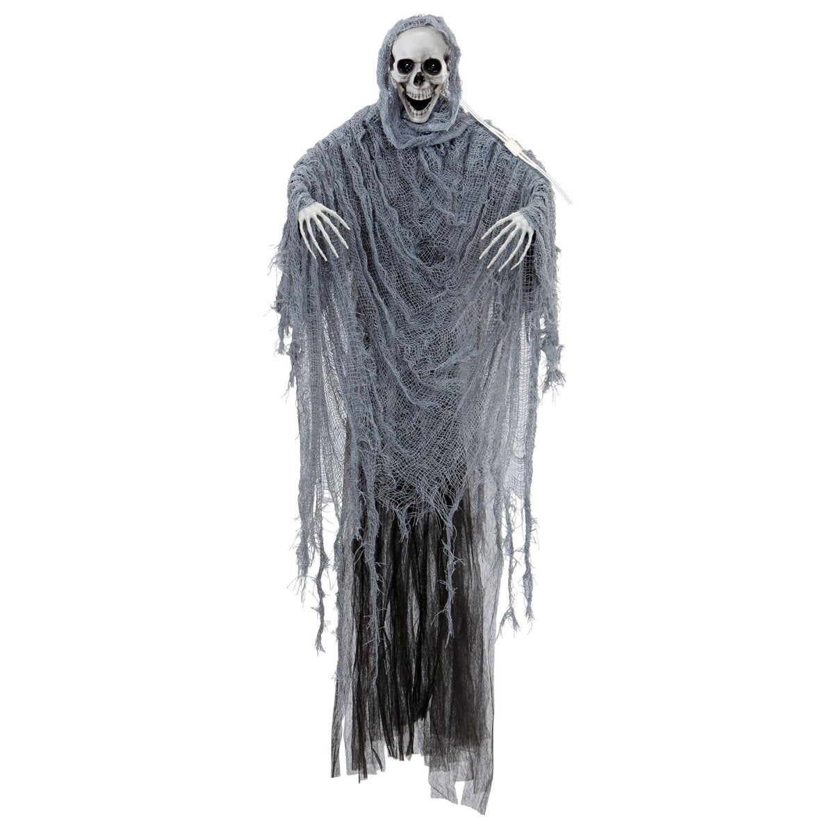 Breng spanning in huis met deze Halloween Magere Hein pop van 100 cm hoog. De pop heeft een bewegend hoofd, oplichtende ogen en maakt enge geluiden voor een extra griezelig effect. Dankzij de geluidssensor reageert hij op geluiden in de buurt en begint automatisch te bewegen en te spreken. De pop werkt op batterijen en is eenvoudig aan te zetten met een schakelaar.