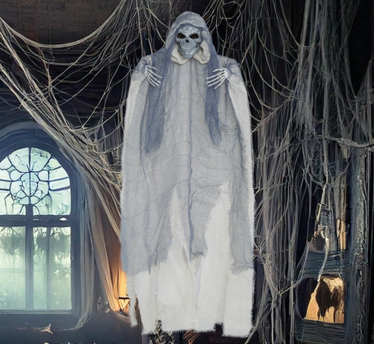Halloween Pop Grijs Skelet Met Cape van 60 cm is de perfecte hangdecoratie voor een enge Halloween-sfeer.