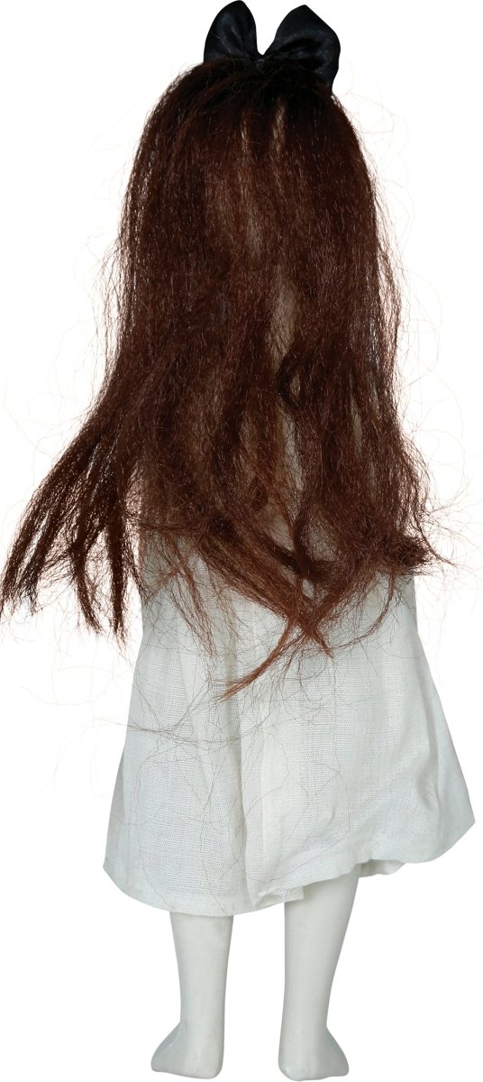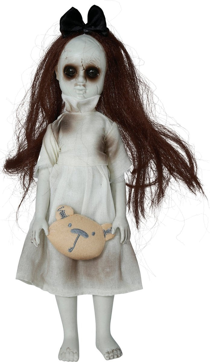 Voeg een griezelige en iconische touch toe aan je Halloweenversiering met deze Halloween pop Meisje met Knuffel van 30 cm. Perfect voor een enge sfeer tijdens Halloween in huis of tuin.