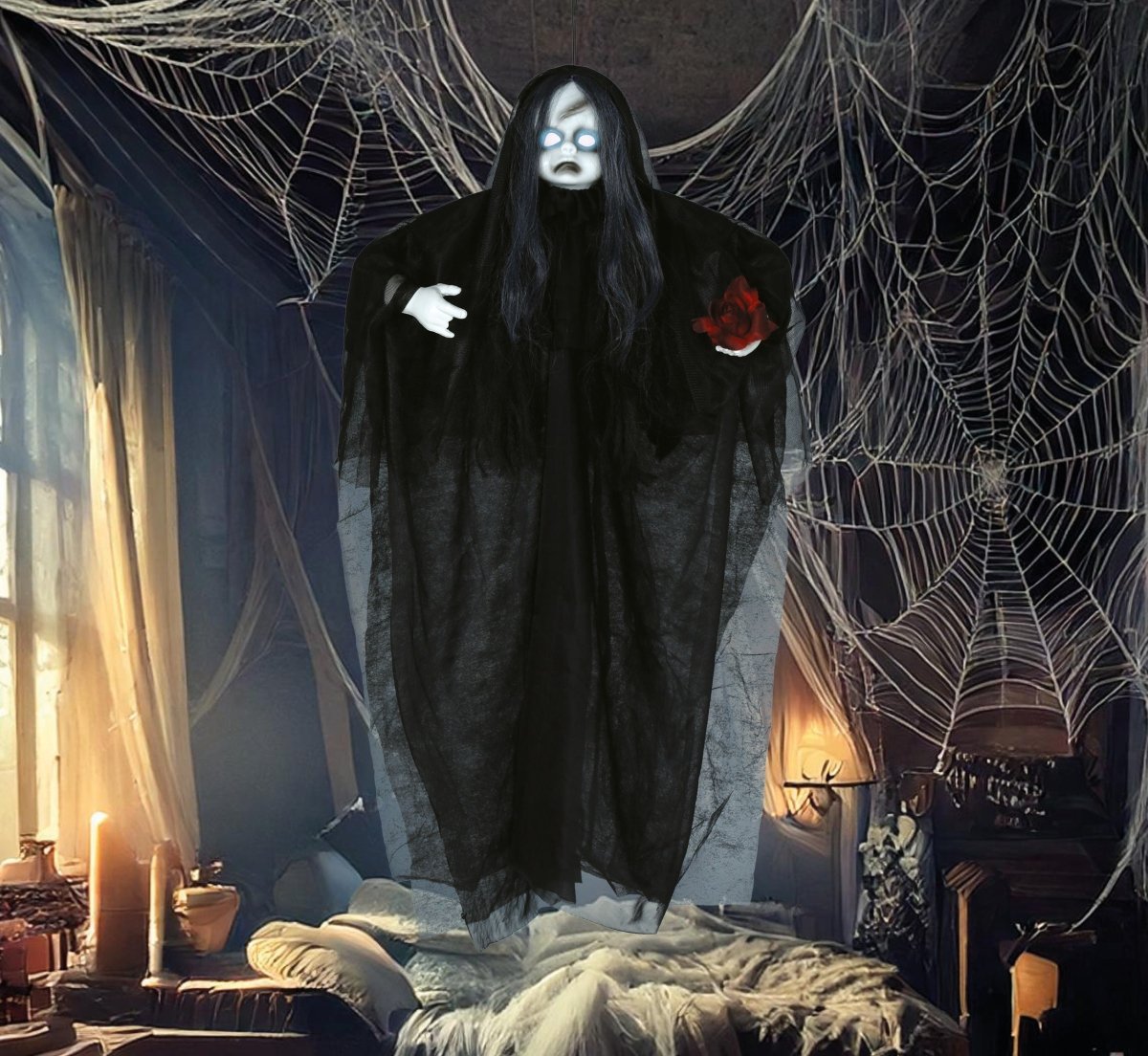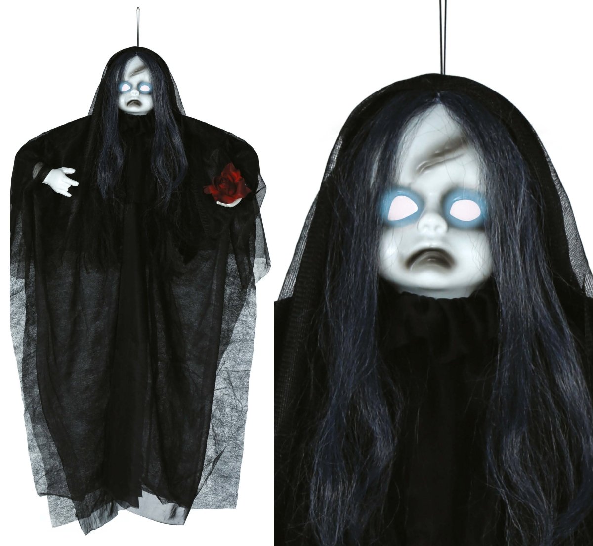 Maak je Halloween-feest angstaanjagend en levendig met deze hangende Pop van 90 cm met licht en geluid. Het interactieve ontwerp trekt direct de aandacht en verhoogt de griezelige sfeer.