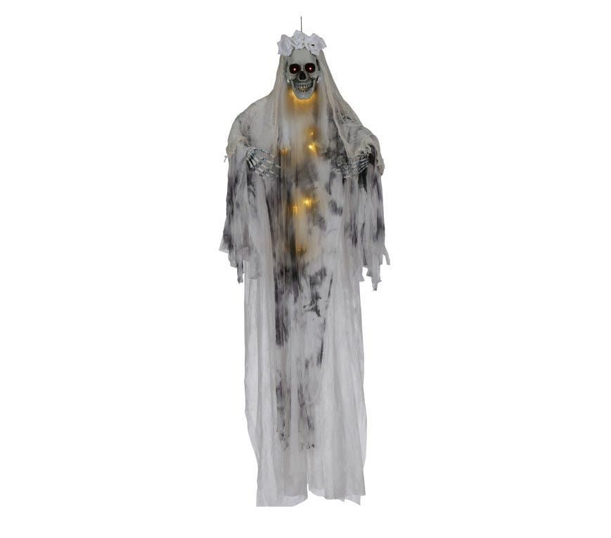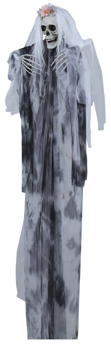 Maak je Halloween-feest griezelig en interactief met deze hangende Skelet Bruid van 1,8 m. De pop reageert op geluid en zorgt direct voor een angstaanjagende sfeer.
