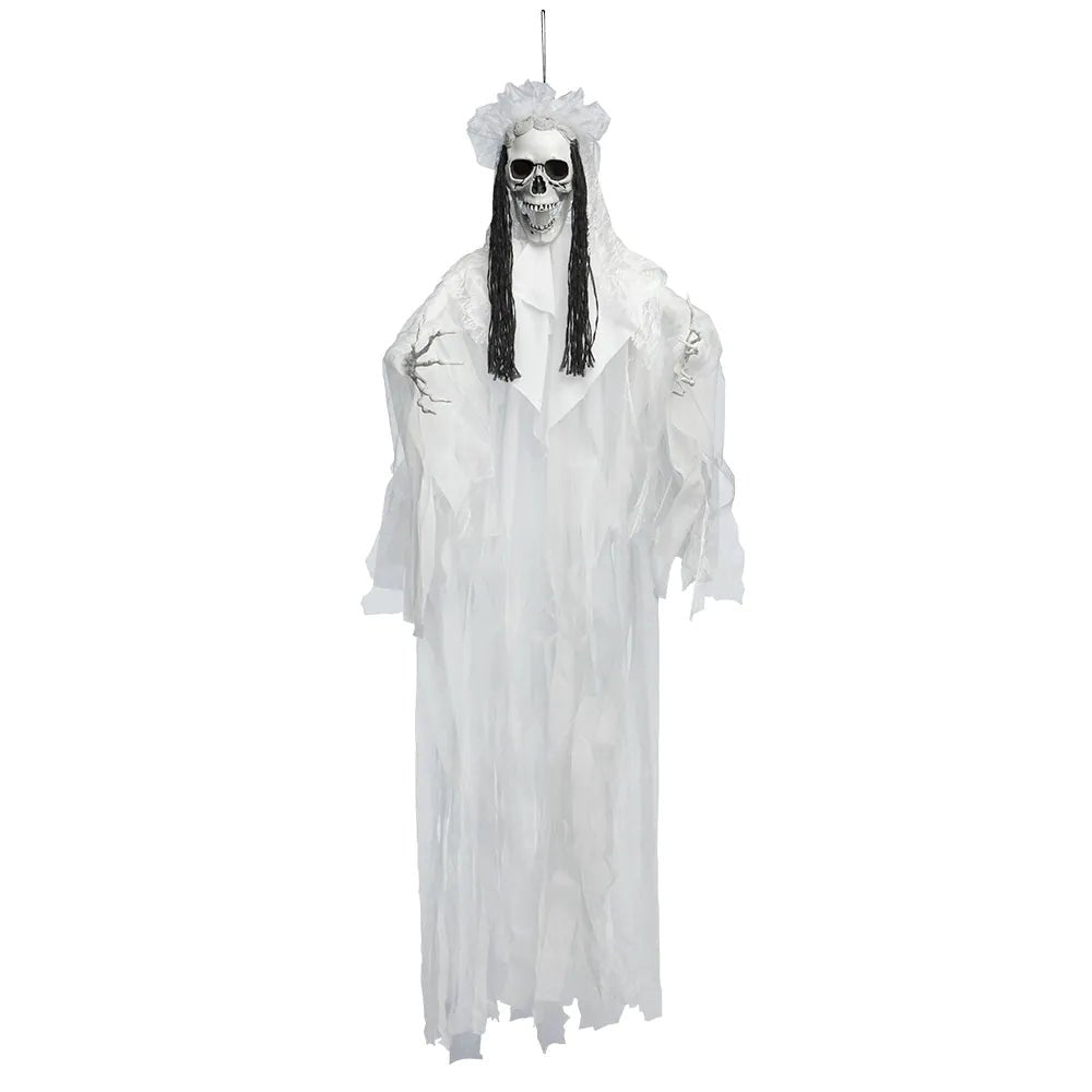 Haar bruidegom heeft haar bij het altaar achtergelaten. Tijdens Halloween komt ze terug uit de dood om wraak te nemen. Dus let op! Deze enge Halloween hangdecoratie is 160 cm lang en heeft flikkerende LED ogen, waardoor ze er nog enger uitziet. Perfect dus om mensen te laten schrikken in een spookhuis of als versiering tijdens Halloween.