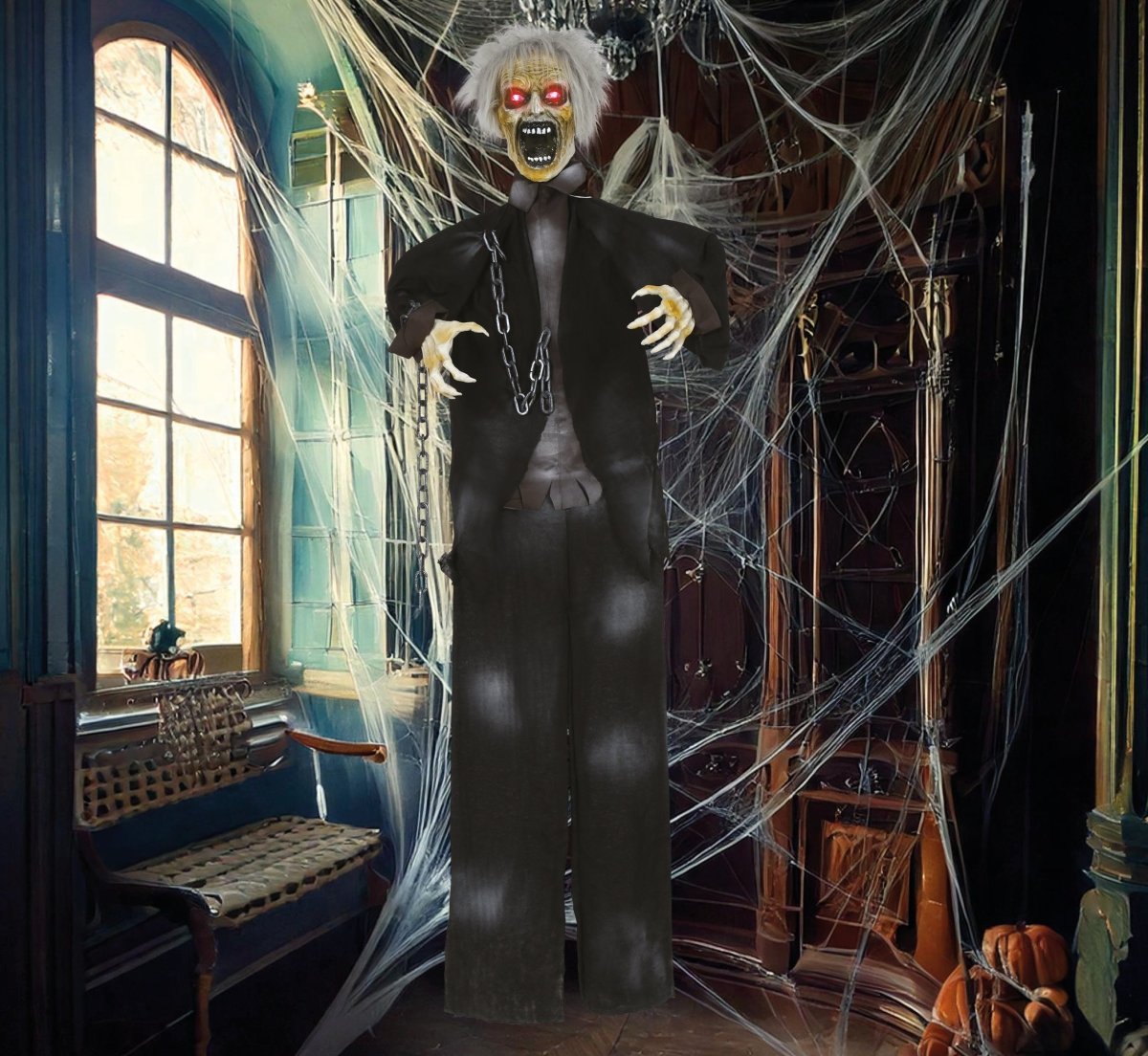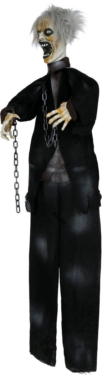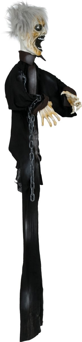 Maak je Halloweenfeest extra griezelig met deze 1,7 meter hoge Halloween Pop Zombie met licht, geluid en beweging. Dankzij de levensechte effecten zorgt deze pop direct voor een angstaanjagende sfeer in je huis of tuin.