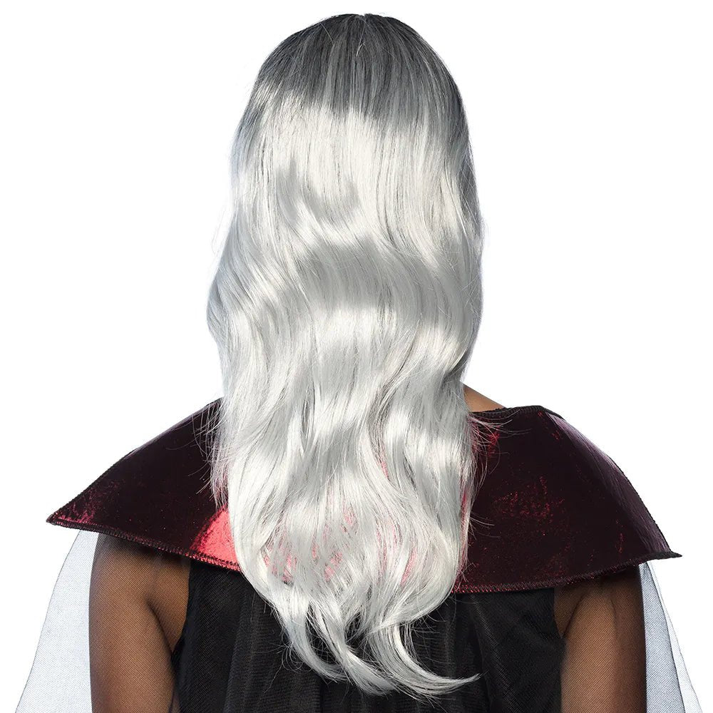 Een mooie gothic dames pruik met lang krullend haar en gordijnpony. De pruik heeft een wit grijze kleur waardoor het een duistere uitstraling krijgt en dus perfect gebruikt kan worden als aanvulling op een griezelig en sexy vampier kostuum voor Halloween.