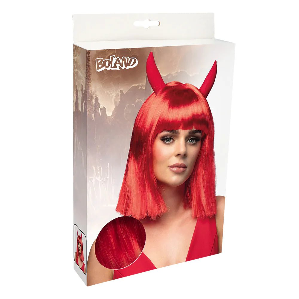 Deze rode devil dames pruik is de perfecte accessoire voor een sexy duivel kostuum. De pruik heeft een lange boblijn look met pony en heeft rode duivelhoorntjes. De perfect haarstijl om er goed uit te zien op een griezelig Halloween feest.