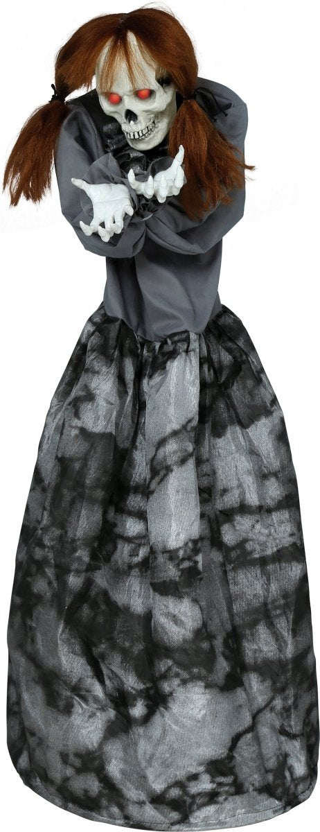 Maak je Halloweendecoratie extra levendig met dit 1,2 meter lange vrouwenskelet. Het skelet is voorzien van licht, geluid en bewegende onderdelen, waardoor het een enge en interactieve toevoeging is voor je feest of tuin.