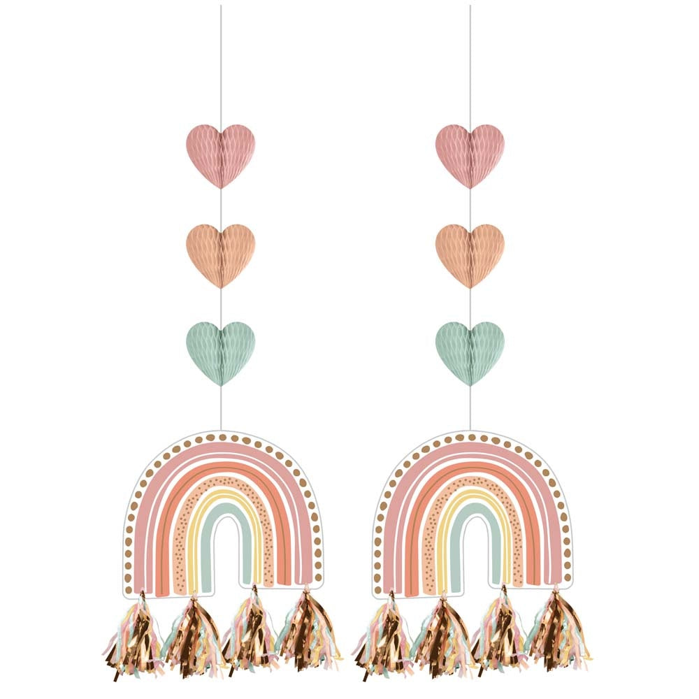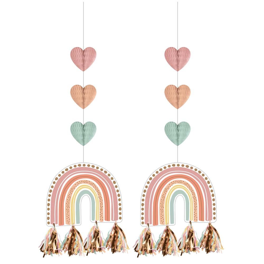 Deze Boho Rainbow hangende uitgesneden decoraties zijn perfect voor iedereen die een pinterest-waardig feest plant. Deze gebruiksvriendelijke hangende decoraties van 91 cm bevatten kleurrijke honingraatharten, een charmante regenboog en leuke pastelkleurige kwastjes. Ideaal voor eerste verjaardag, babyshower, kinderverjaardag en meer!