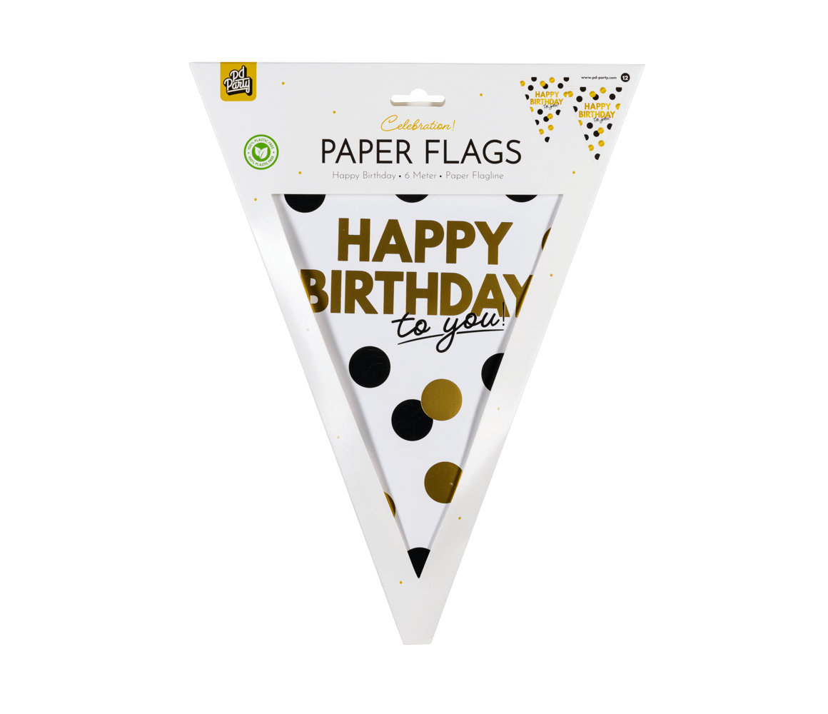De Celebration! paper flags - Happy birthday zijn de perfecte vlaggetjes om een verjaardagsfeestje op te leuken! Deze vlaggenlijn valt op door zijn onderscheidende design en omdat de vlaggetjes gemaakt zijn van papier denk je ook nog eens aan het milieu! De paper flags zijn 6 meter lang. Combineer ze met de bijpassende celebration! balloons!