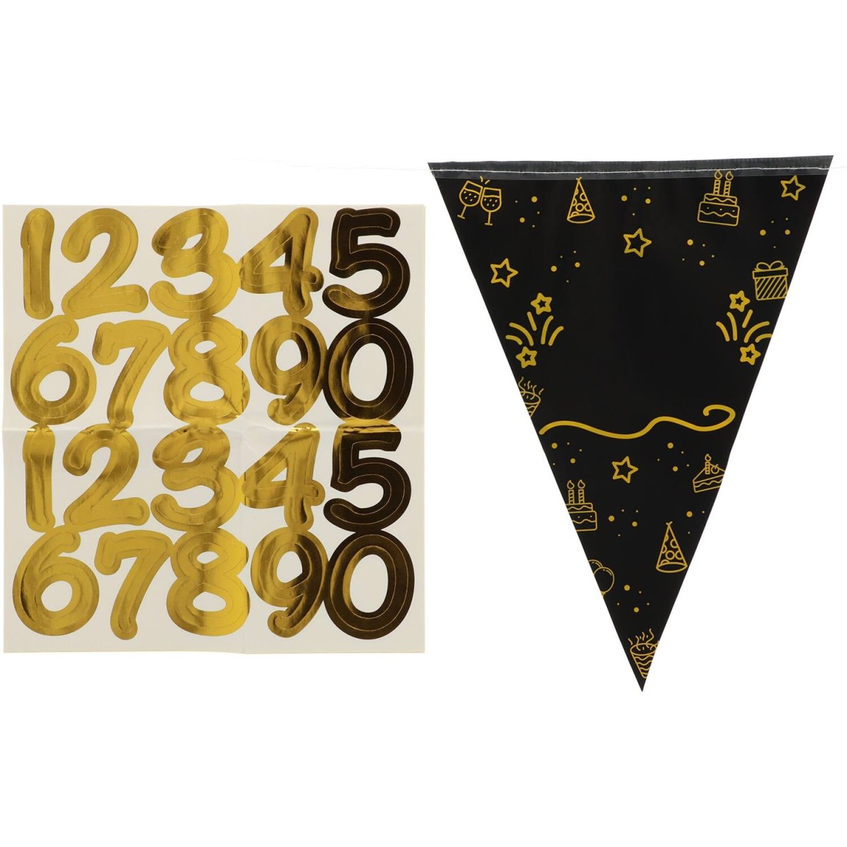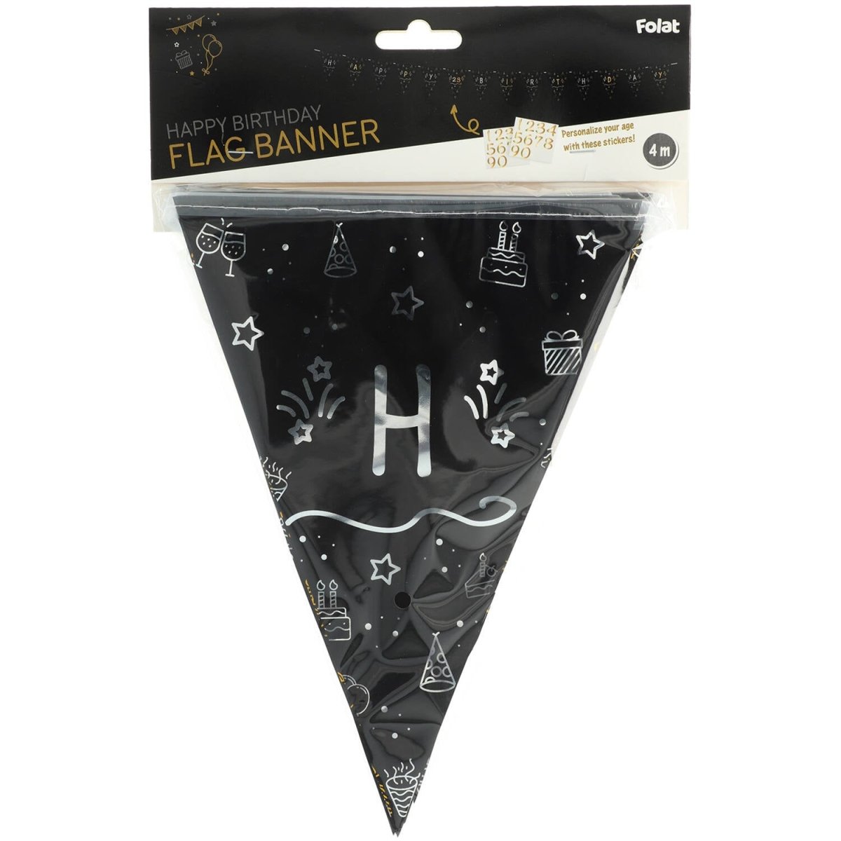 Fijne verjaardag! Vlaggenlijn - Shining Glam - 4 meter. Inhoud: 1 vlaggenlijn. Bijvoorbeeld te gebruiken tijdens de volgende feestgelegenheid/feestgelegenheden: Verjaardag. Vlaggenlijn waarop zelf de leeftijd geplakt kan worden. De vlaggen zijn zwart met daarop in glanzend goud het Shining Glam patroon. Op iedere vlag staat 1 letter, bij elkaar is dan te lezen "HAPPY" en "BIRTHDAY", de ene kant is met goud bedrukt en de andere kant zilver.Tussen deze twee woorden is een lege vlag. Op deze vlag kan de leeftijd geplakt worden met de bijgeleverde glanzend gouden stickers van 4 cm hoog. Er zitten 14 vlaggen aan de vlaggenlijn van ongeveer 17 x 22 cm. De vlaggenlijn is 4 meter lang. Deze hangdecoratie hoort bij de Shining Glam collectie van Folat. Dit artikel is gemaakt van plastic