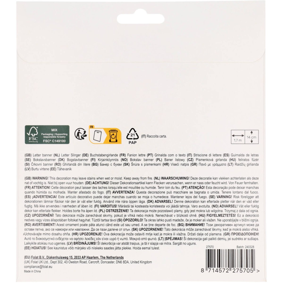 De jarige scoort altijd! Letterslinger Set - Fantastic Football - 1,5 meter. Inhoud: 1 letterslinger uit 2 delen. Bijvoorbeeld te gebruiken tijdens de volgende feestgelegenheid/feestgelegenheden: Kinderfeestje, Verjaardag. De slinger bestaat uit twee delen: een slinger met de tekst "HAPPY BIRTHDAY " (letters ongeveer 14 cm hoog) met aan weerszijden een gouden kampioensbeker, en een slinger met de tekst "ITS A GOAL" (letters ongeveer 14 cm hoog) met aan weerszijden een voetbaldoel. Dubbelzijdig bedrukt. Alle onderdelen kunnen heen en weer worden geschoven over het lichtgrijze lint. Alle gouden details glanzend echt dankzij de gebruikte hotstamping techniek. De linten van beide slingers zijn 1,7 meter lang. Deze letterslinger set hoort bij de Fantastic Footbal collectie van Folat. Dit artikel is gemaakt van papier.