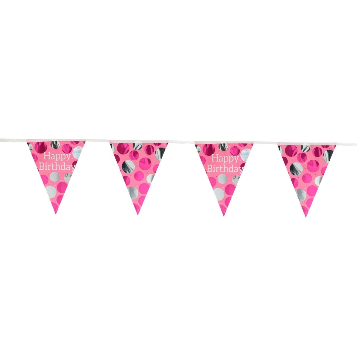 Vlaggenlijn Glossy Pink 'Happy Birthday' - 4 meter. Inhoud: 1 vlaggenlijn van 4 meter. Kleur: Roze. Bijvoorbeeld te gebruiken tijdens de volgende feestgelegenheid/feestgelegenheden: Verjaardag, Kinderfeestje en Tienerfeestje. Deze slinger is 4 meter lang. Het artikel is gemaakt van folie.