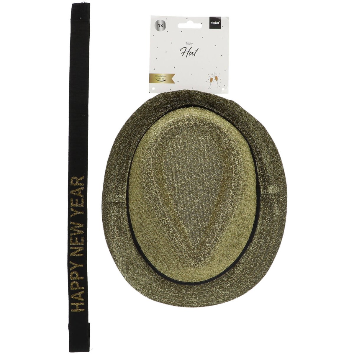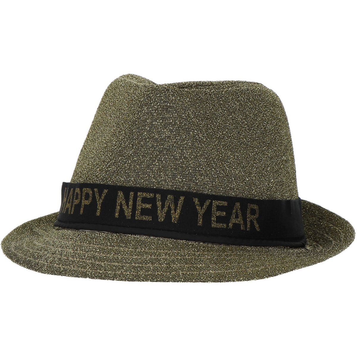 Trilby Hoed 'Happy New Year' Lurex Goudkleurig. Inhoud: 1 hoed. Kleur: Goudkleurig. Bijvoorbeeld te gebruiken tijdens de volgende feestgelegenheid/feestgelegenheden: Oud & Nieuw en Themafeesten. Hoedmaat: 59 cm. De hoed heeft een afneembaar lint met de tekst "Happy New Year". Verwijder het lint en gebruik de hoed voor andere themafeesten. Het artikel is gemaakt van polyester.