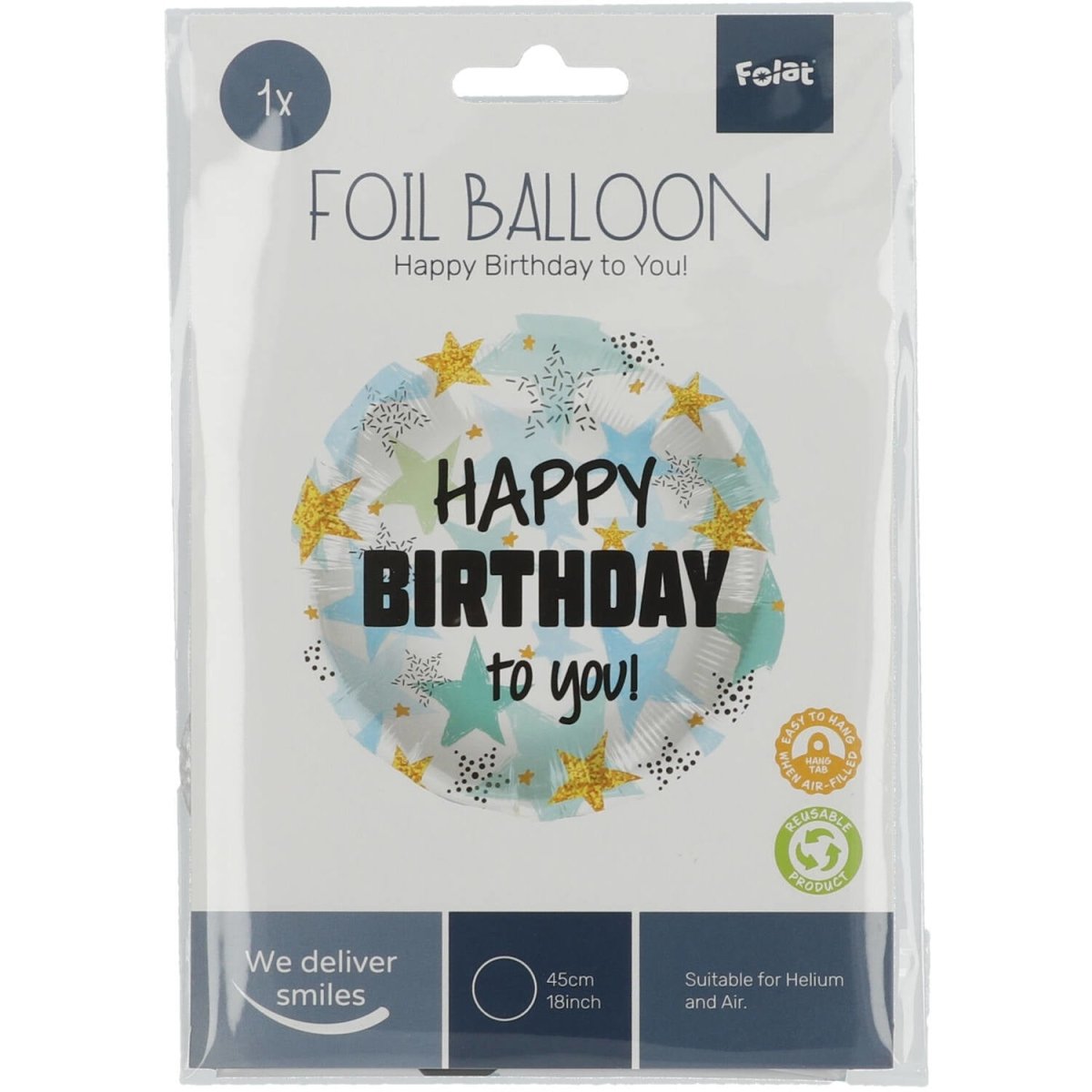 Folat Folieballon Verjaardag Sterren Blauw/Goud - 45 cm. Inhoud: 1 folieballon. Kleur: Meerkleurig. Bijvoorbeeld te gebruiken tijdens de volgende feestgelegenheid/feestgelegenheden: Verjaardag en Kinderfeestje. Deze folieballon is 18 inch/45 cm. Het artikel is gemaakt van folie.