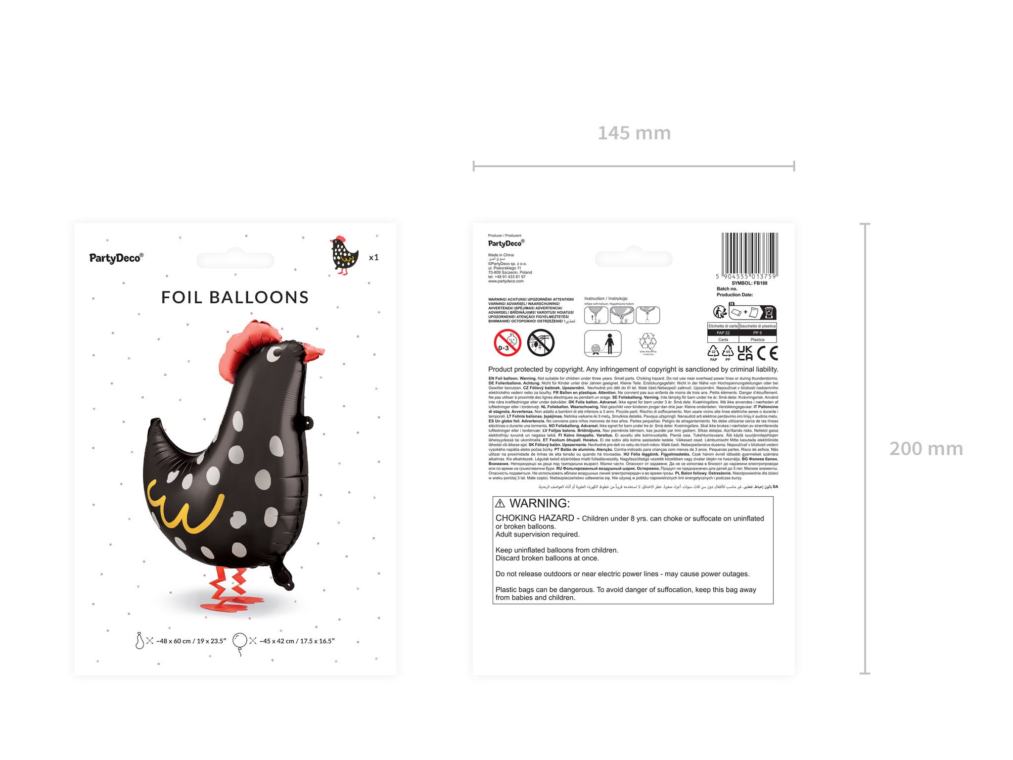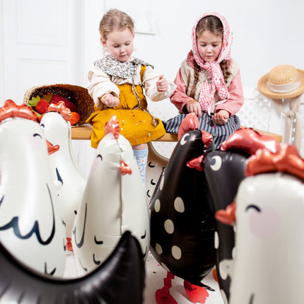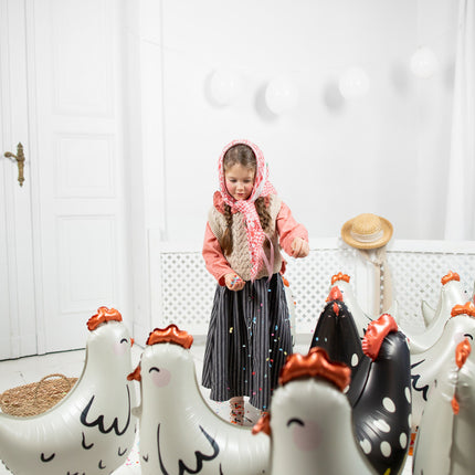 Rooster folieballon, diverse kleuren, afmetingen voor opblazen ca. 48 x 60 (19 x 23,5''), afmetingen na opblazen ca. 45 x 42 cm (17,5 x 16,5''). Te vullen met helium. De set is inclusief een rietje