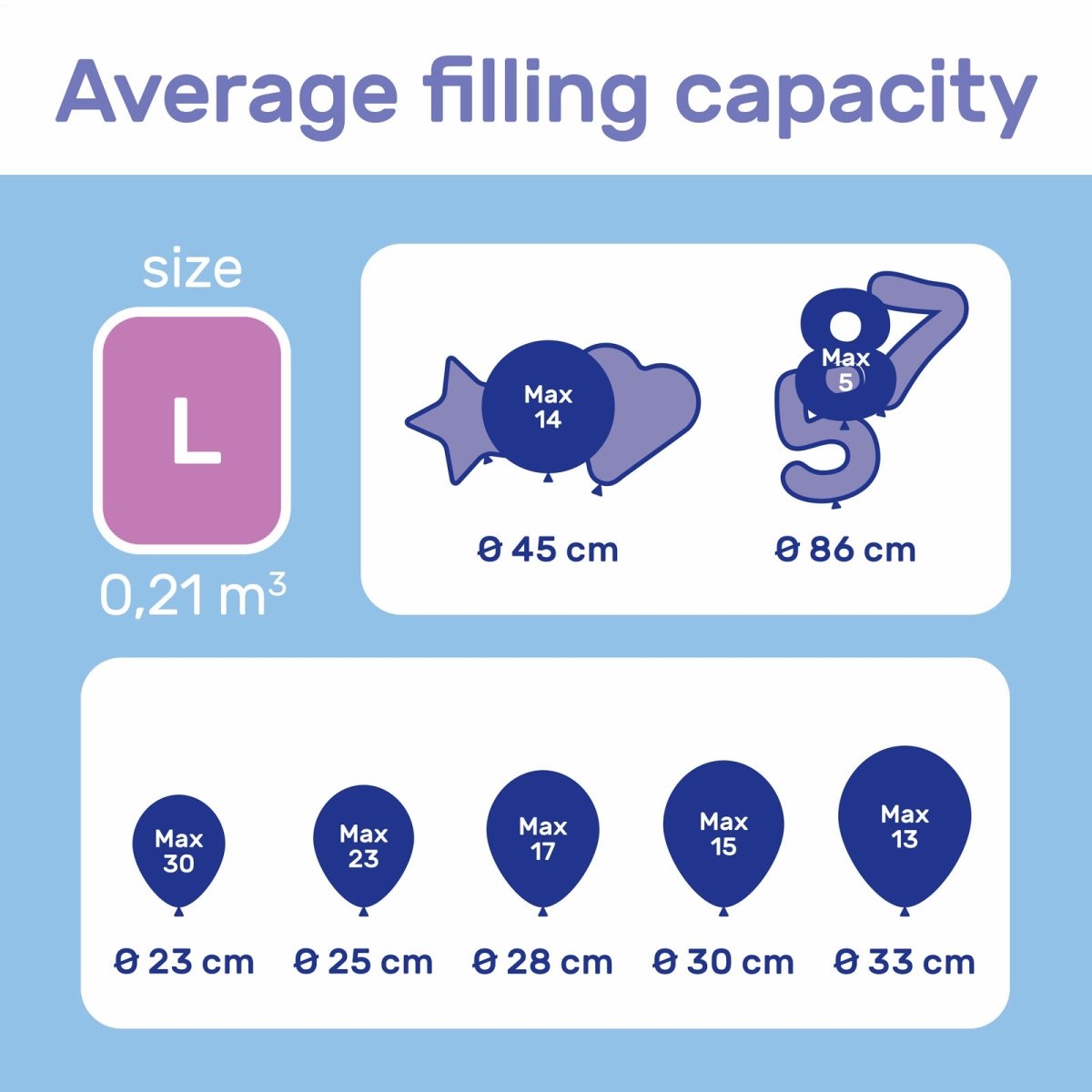 Elke centimeter die een ballon groter is, heeft invloed op de inhoud. De helium tanks zijn gebaseerd op 25cm ballonnen, wanneer je bijvoorbeeld 30cm ballonnen gebruikt kun je slechts de helft van het aantal stuks uit de helium tank halen.