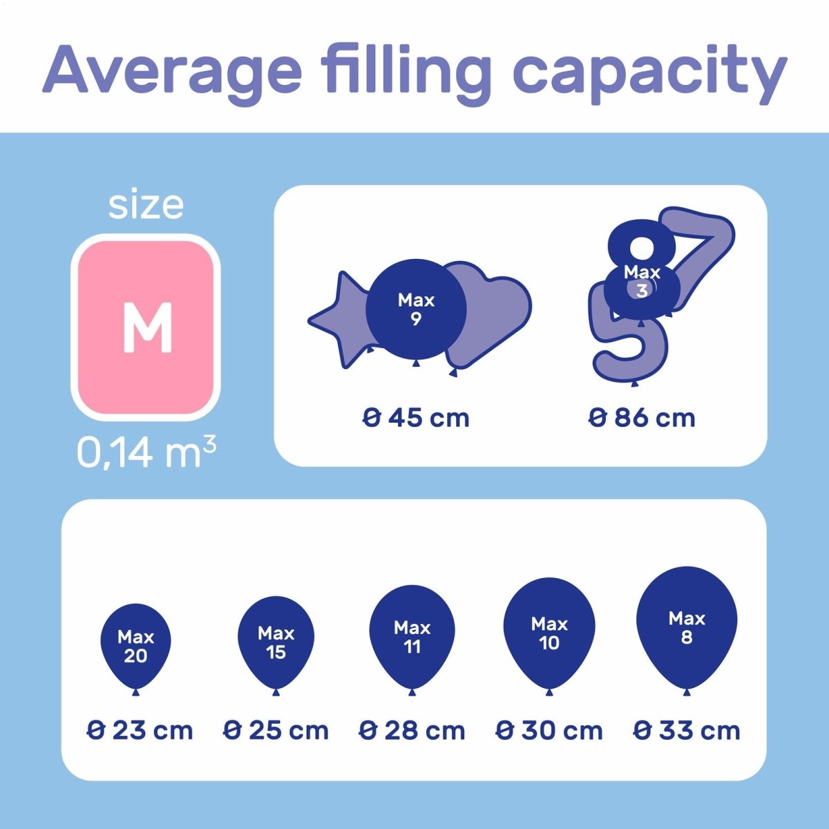 Elke centimeter die een ballon groter is, heeft invloed op de inhoud. De helium tanks zijn gebaseerd op 25cm ballonnen, wanneer je bijvoorbeeld 30cm ballonnen gebruikt kun je slechts de helft van het aantal stuks uit de helium tank halen.
