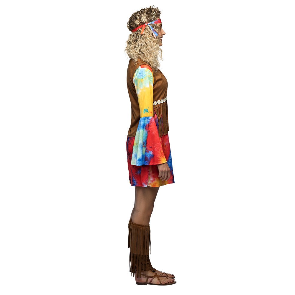 Voeg wat flower power toe aan carnaval of een themafeest en betover iedereen met dit vrolijke 70s Hippie kostuum. Dit retro kostuum bestaat uit een jurkje, vestje, hoofdband, ketting en beenbeschermers.