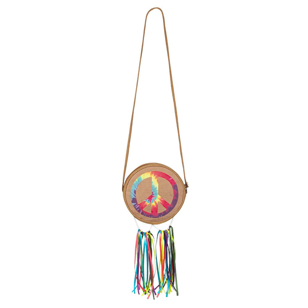 Ga terug naar de flowerpower-jaren met dit kleurrijke hippie schoudertasje. Het ronde ontwerp met peace-teken en vrolijke linten geeft elke outfit een speelse, retro 70s vibe. Perfect voor festivals, themafeesten of een zomerse dag.