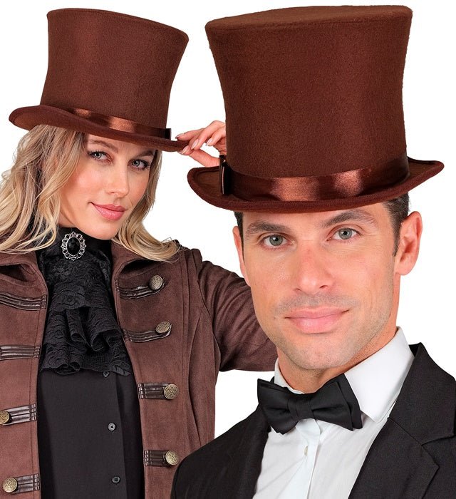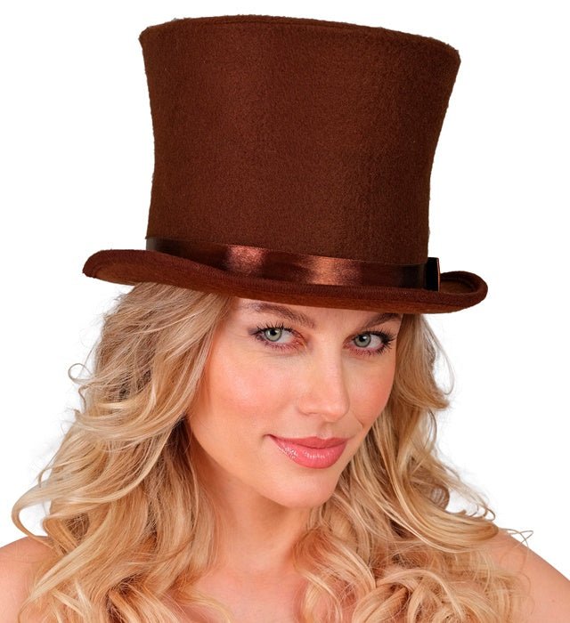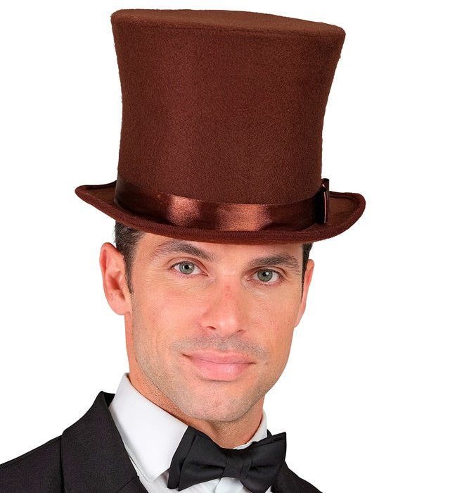 Geef je outfit een klassieke en stijlvolle uitstraling met deze bruine hoge hoed. Perfect voor themafeesten, carnaval, verkleedpartijen of historische kostuums.