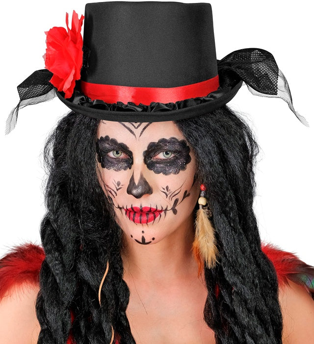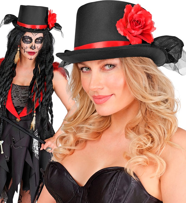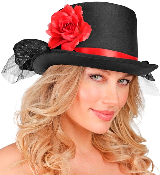 Maak elke outfit dramatisch en stijlvol met deze hoge zwarte hoed, versierd met tule en een opvallende rode roos, perfect voor verkleedfeestjes, thema-evenementen of Halloween.