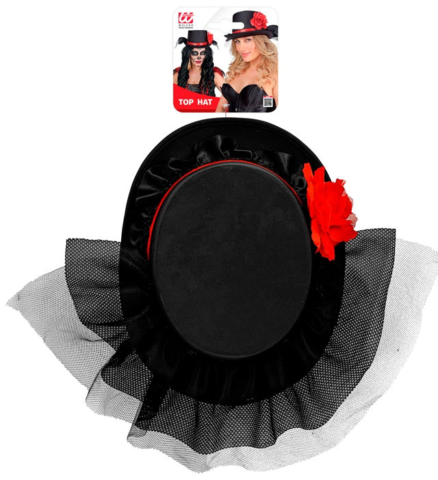HOGE HOED ZWART MET TULE EN RODE ROOS